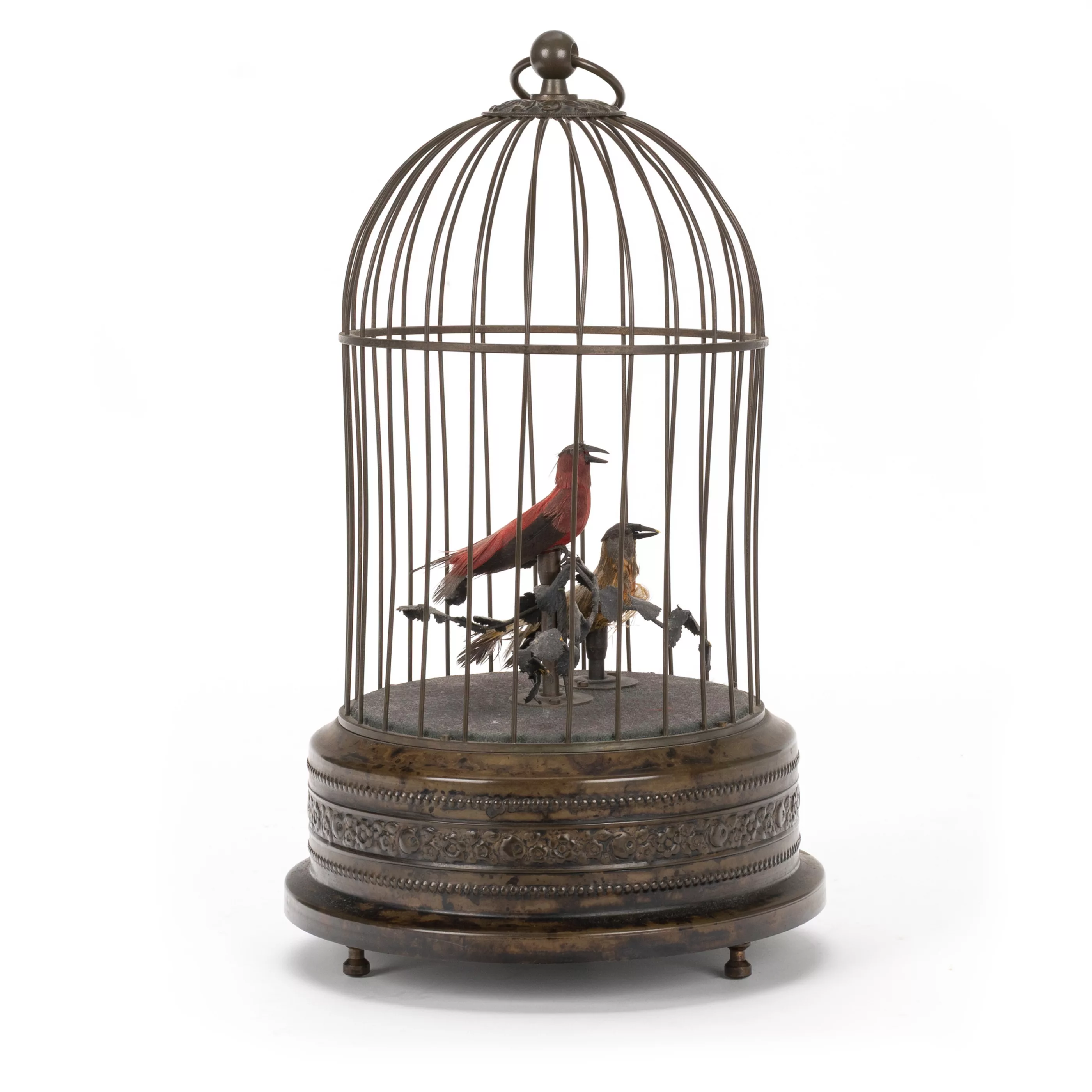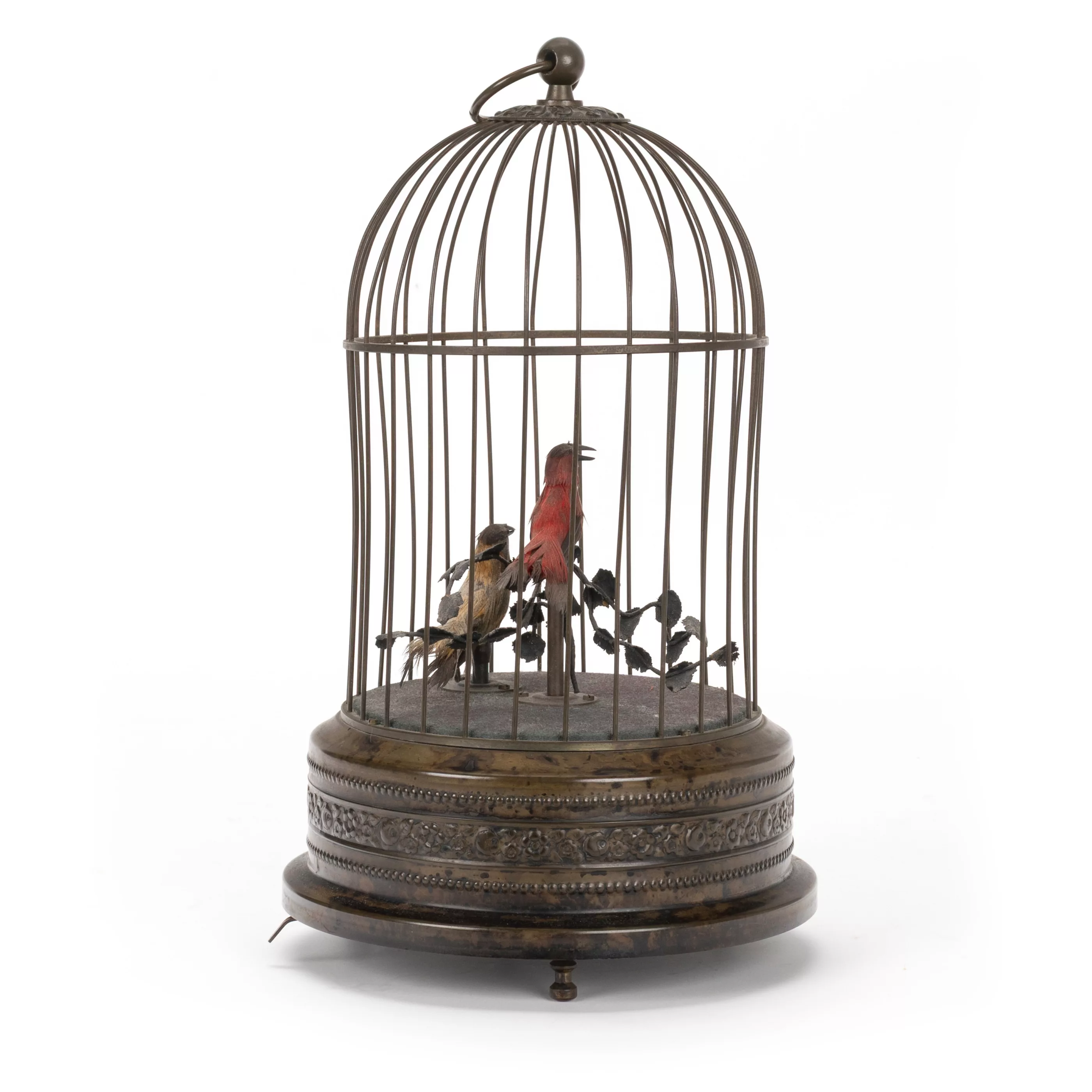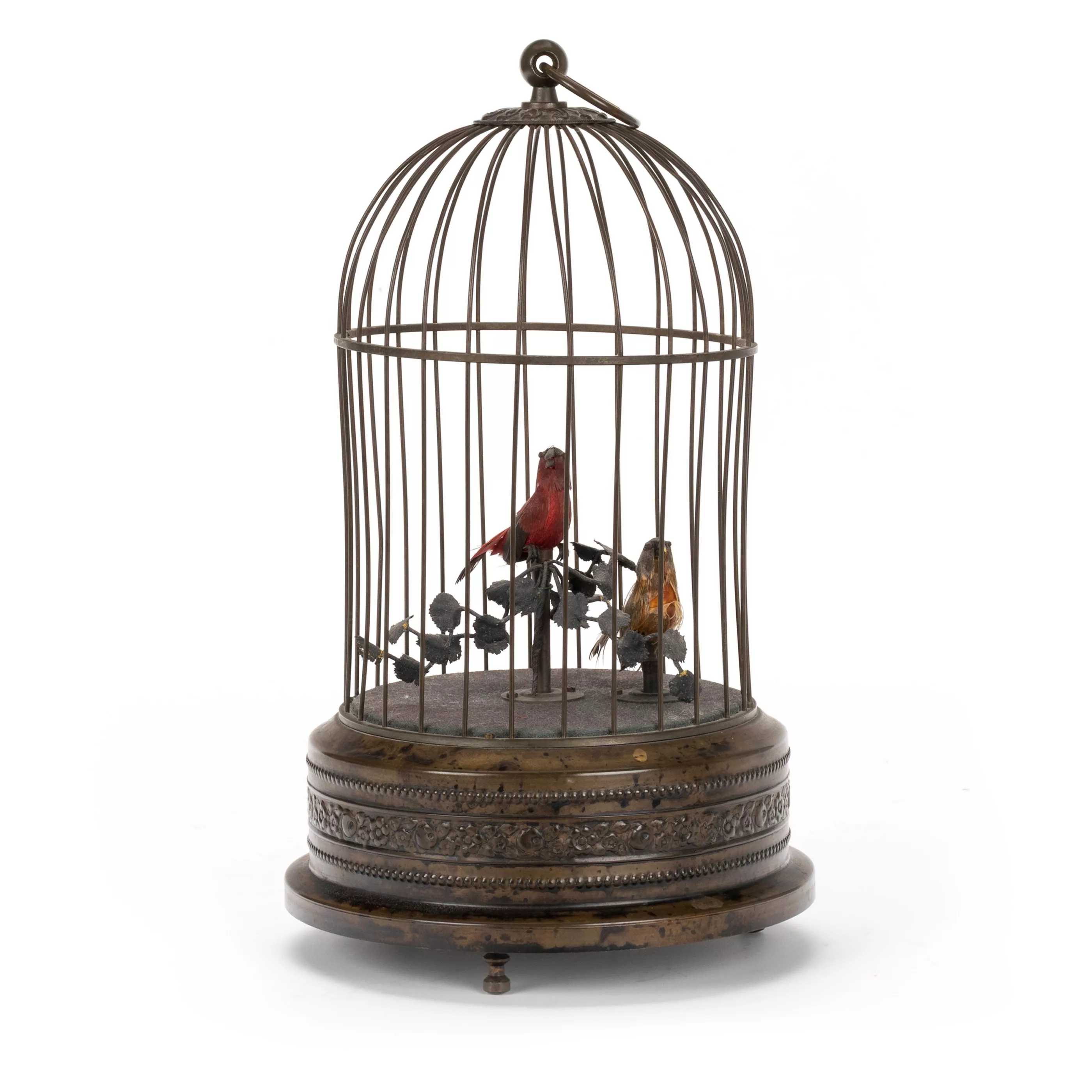 Griesbaum (attrib.), Germany, 20th century, spring-wound, bird song and movement automaton, stop motion, 2 birds in plumage, in coupled cage on round brass base, height 28 cm, in working order, slightly dusty inside, individual feathers detached