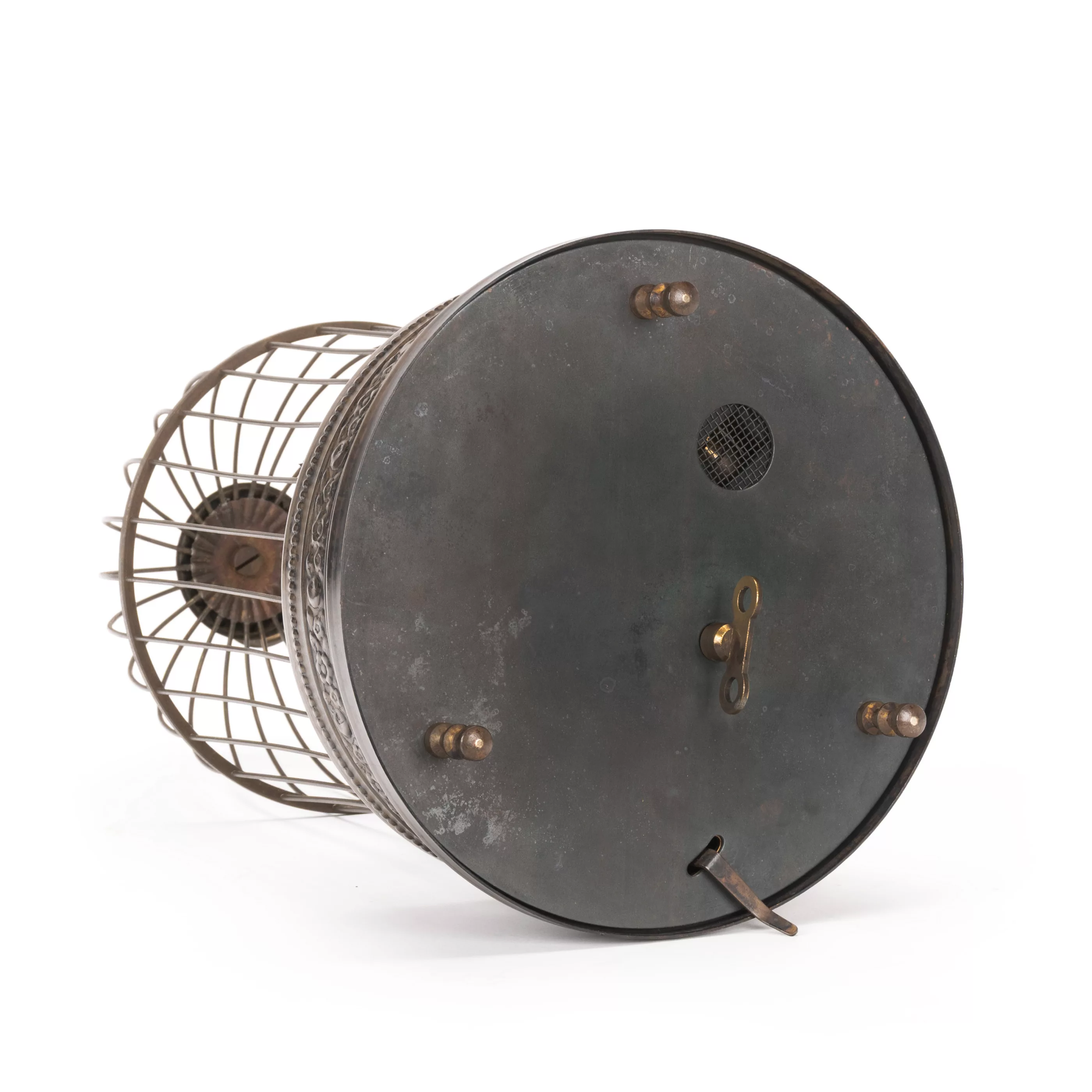 Griesbaum (zugeschrieben), Deutschland, 20. Jh., Federaufzug, Vogelgesang- und Bewegungsautomat, abstellbares Werk, 2 Vögel im Federkleid, in gekuppeltem Käfig auf rundem Messingsockel, Höhe 28 cm, funktionstüchtig, innen leicht staubig, einzelne Federn lösen sich