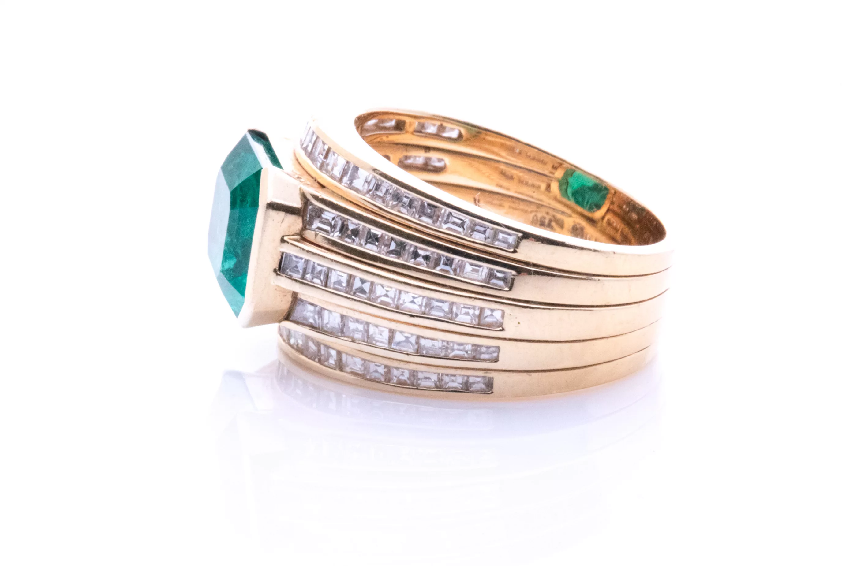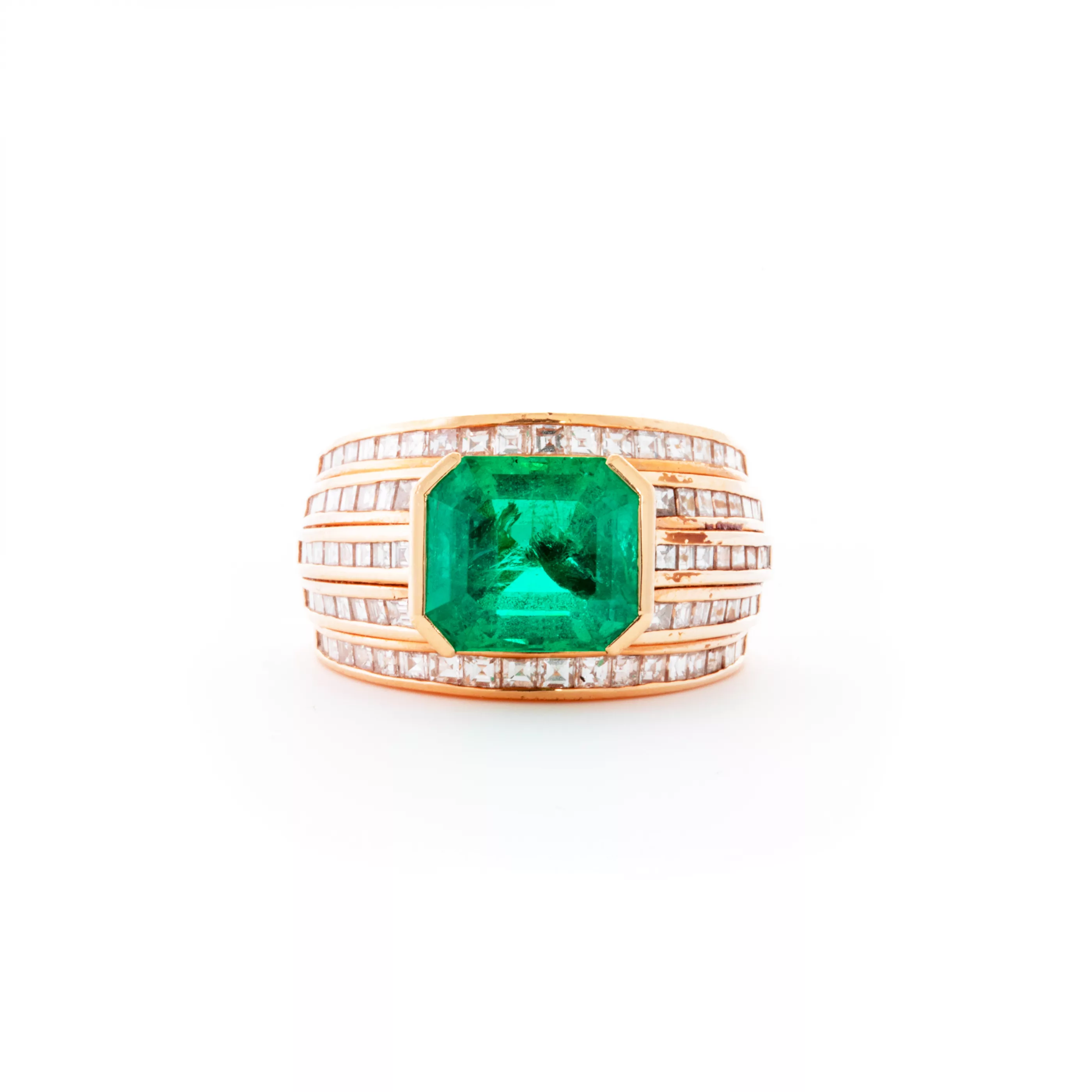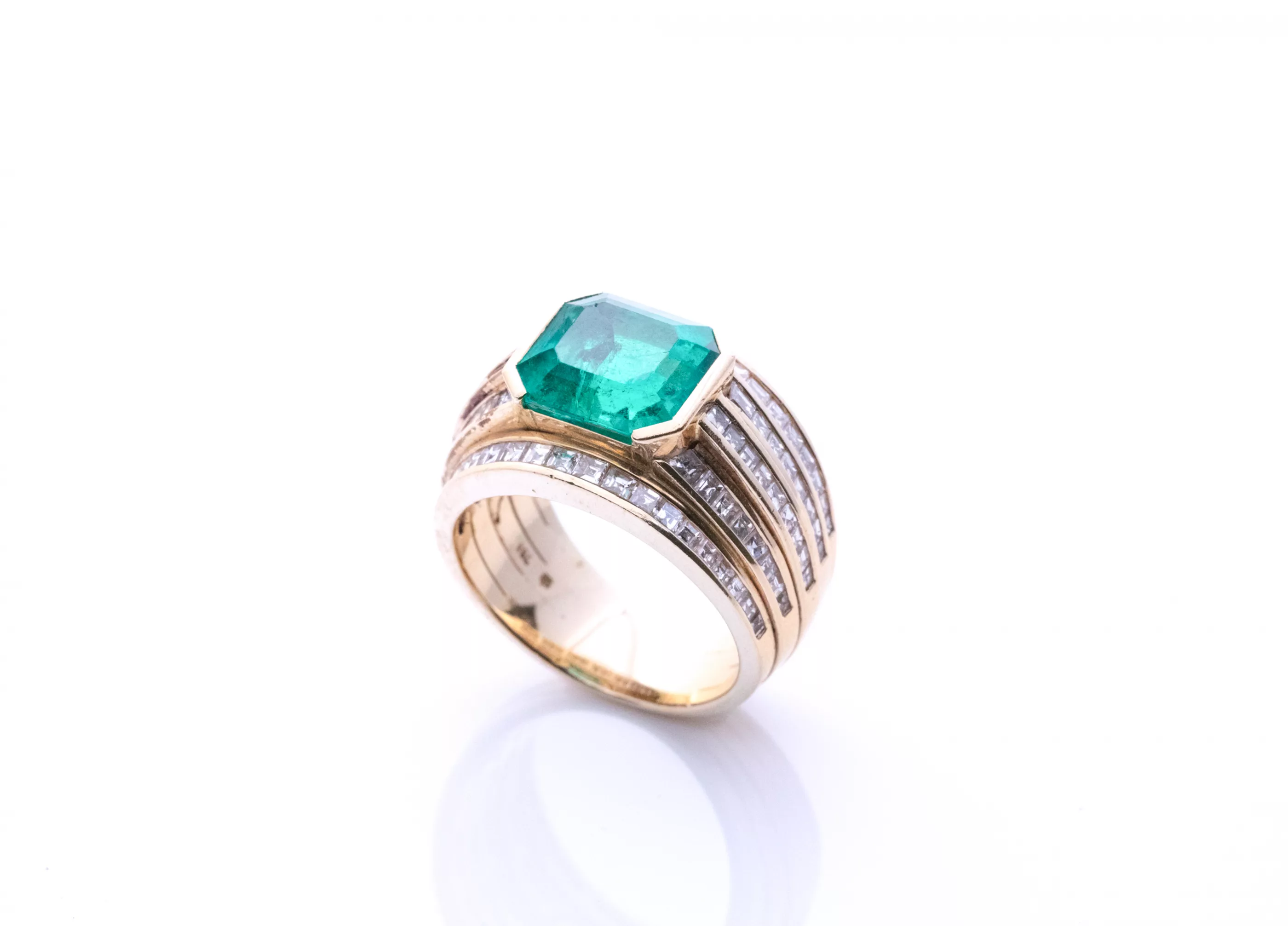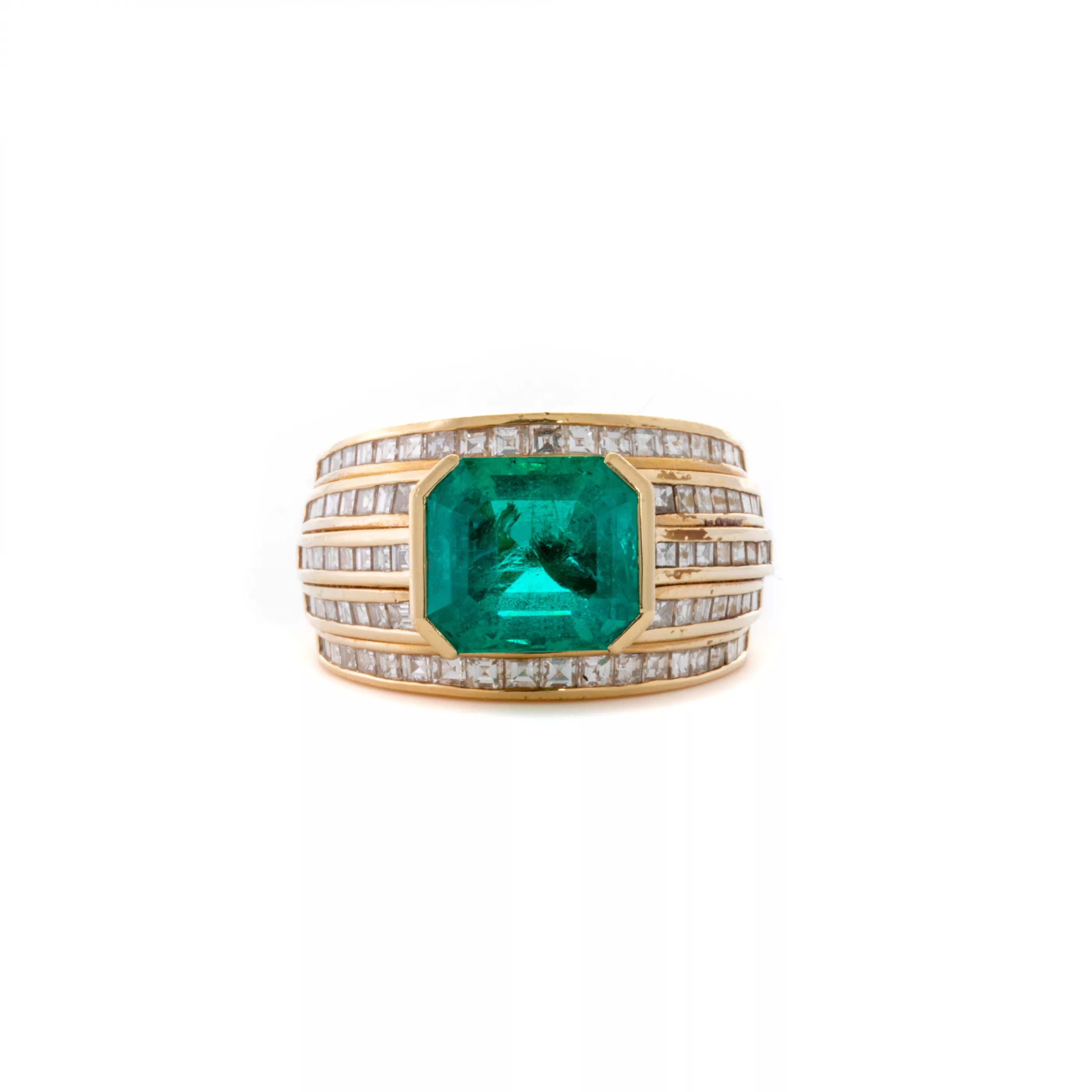 750 Gelbgold, punziert, besetzt mit Diamanten im Carré-Schliff, zus. ca. 1,8 ct, G, VVS-VSI, Smaragd von ca. 4 ct im Treppen-Schliff, mit Rissen und bestoßen, sehr schöne Farbe und Transparenz, Ringgröße 56, Gesamtgewicht ca. 15,9 g