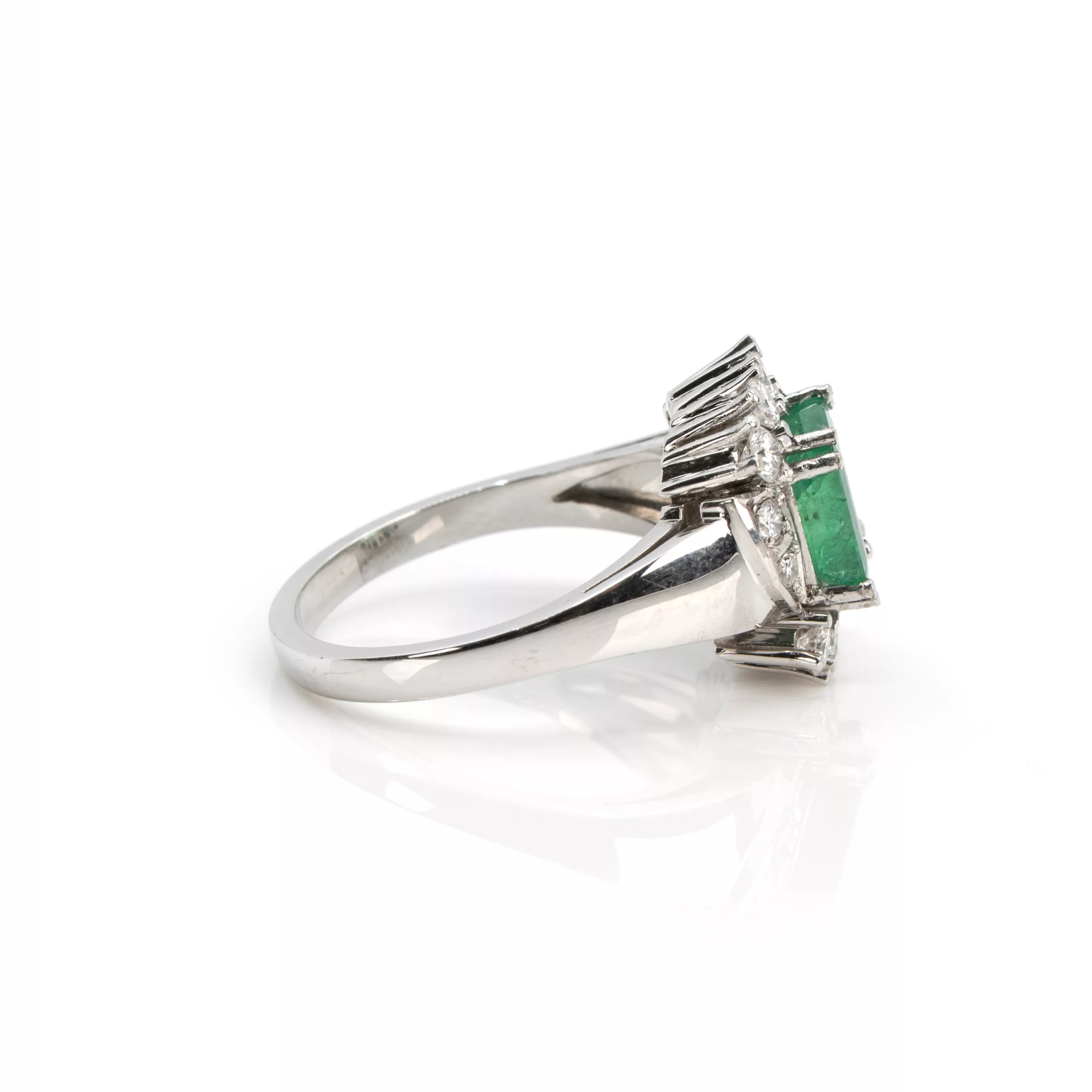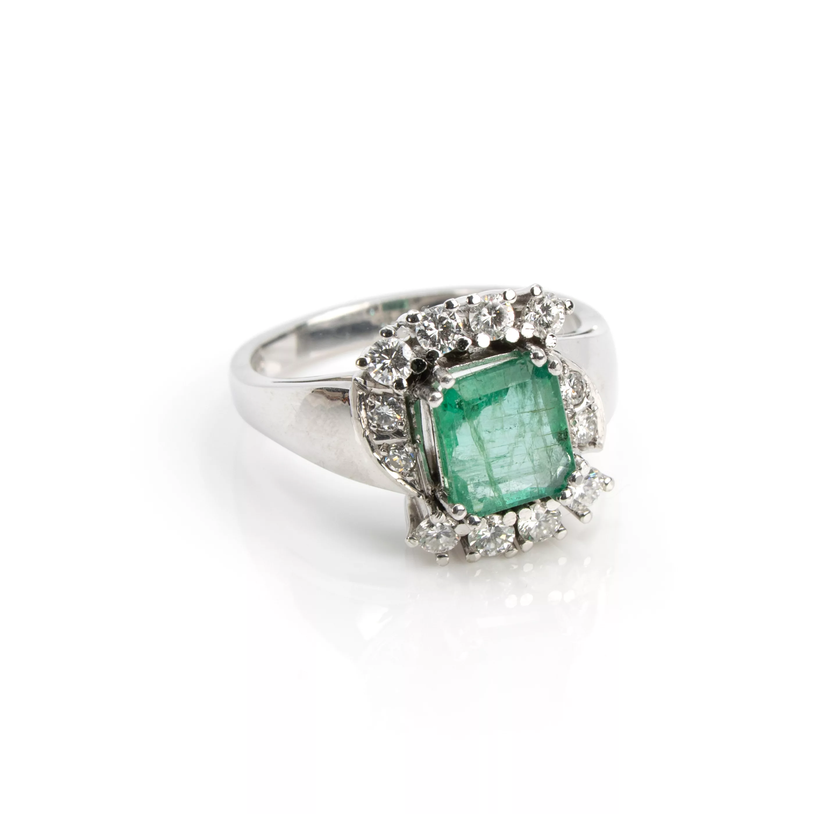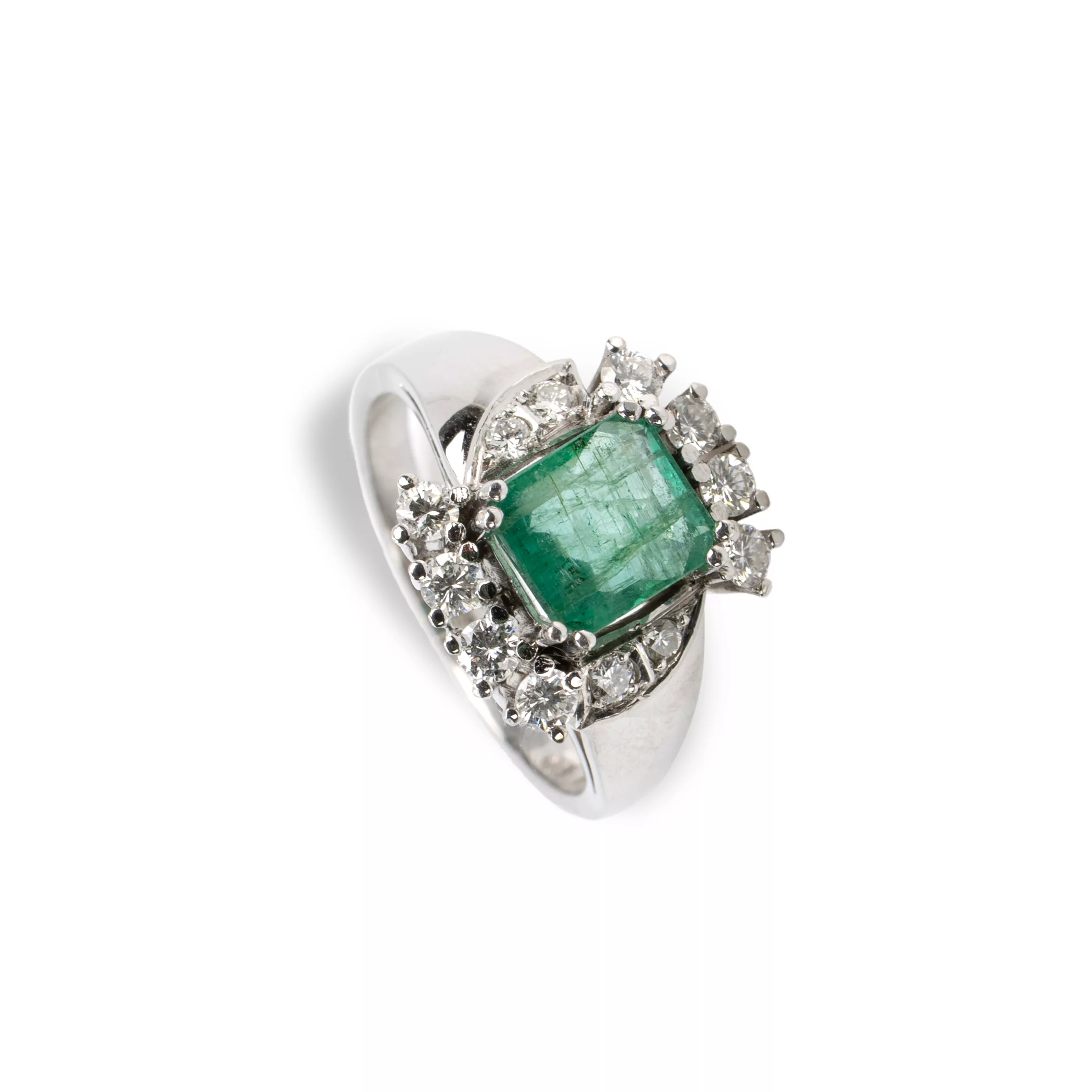 750 Weißgold, punziert, 12 Diamanten im Brillantschliff, gesamt ca. 0,32 ct, G-H, vs, Smaragd im Smaragdschliff, ca. 1,25 ct, RW 54, Gewicht ca. 6,9 g