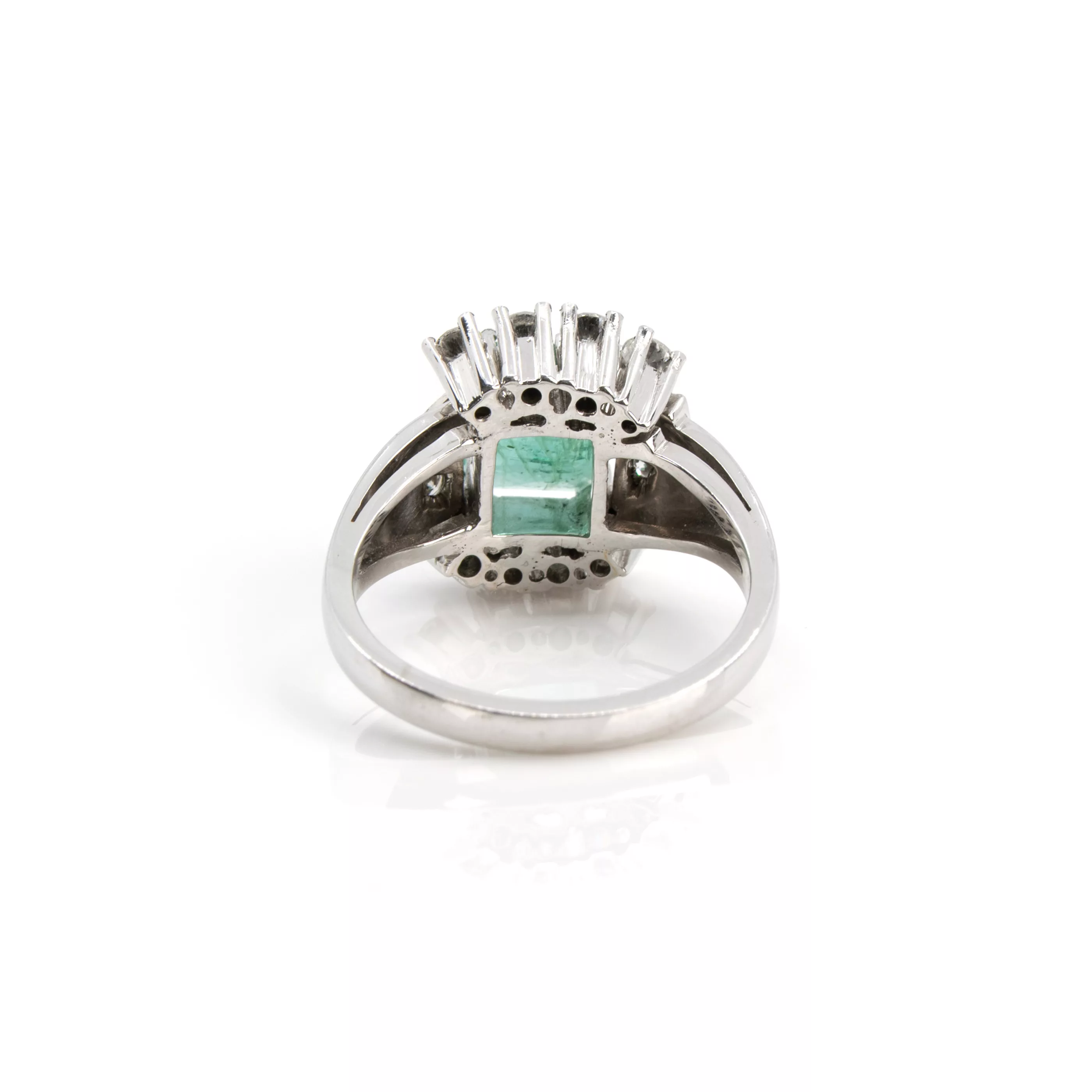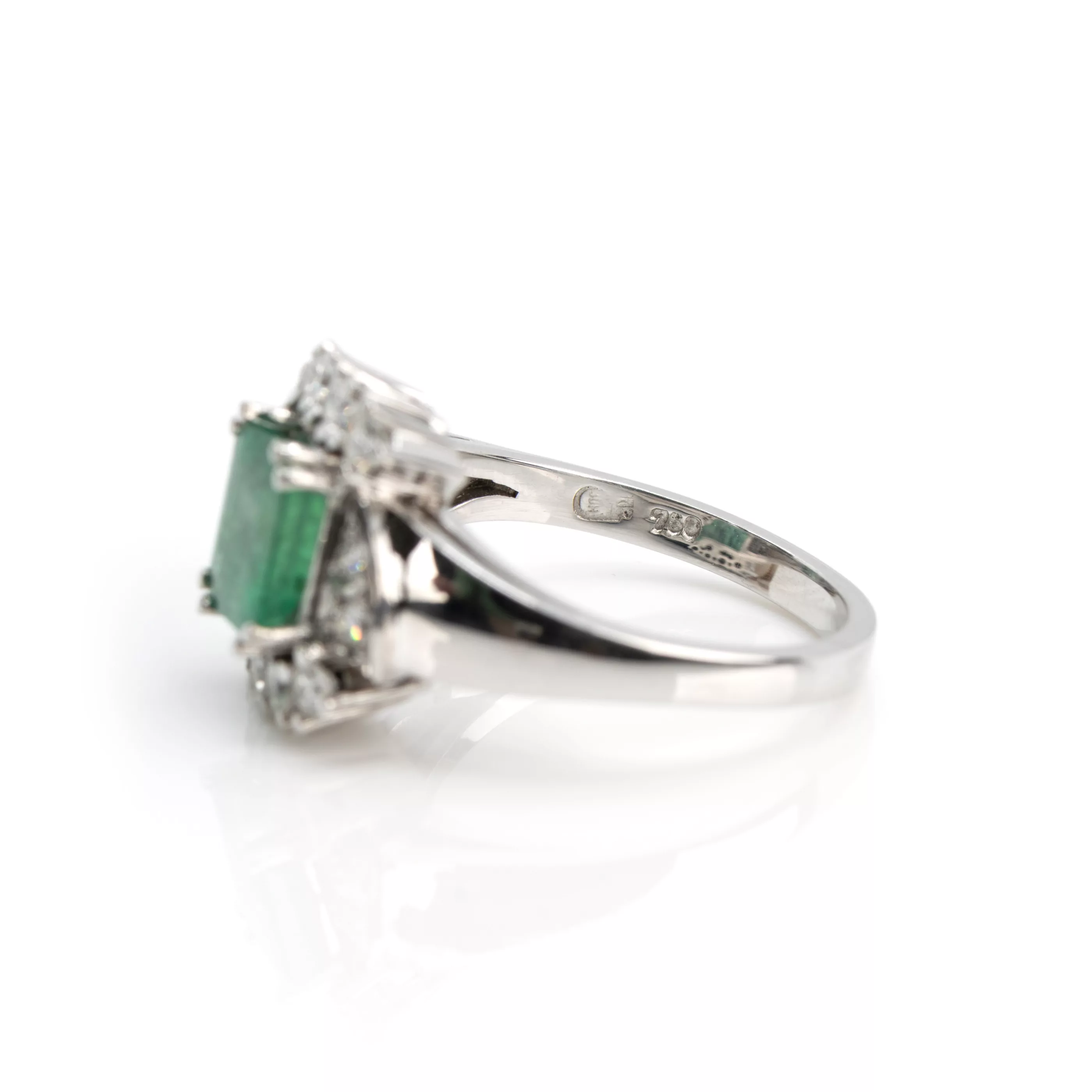 750 white gold, hallmarked, 12 brilliant-cut diamonds, total approx. 0.32 ct, G-H, vs, emerald in emerald cut, approx. 1.25 ct, RW 54, weight approx. 6.9 g