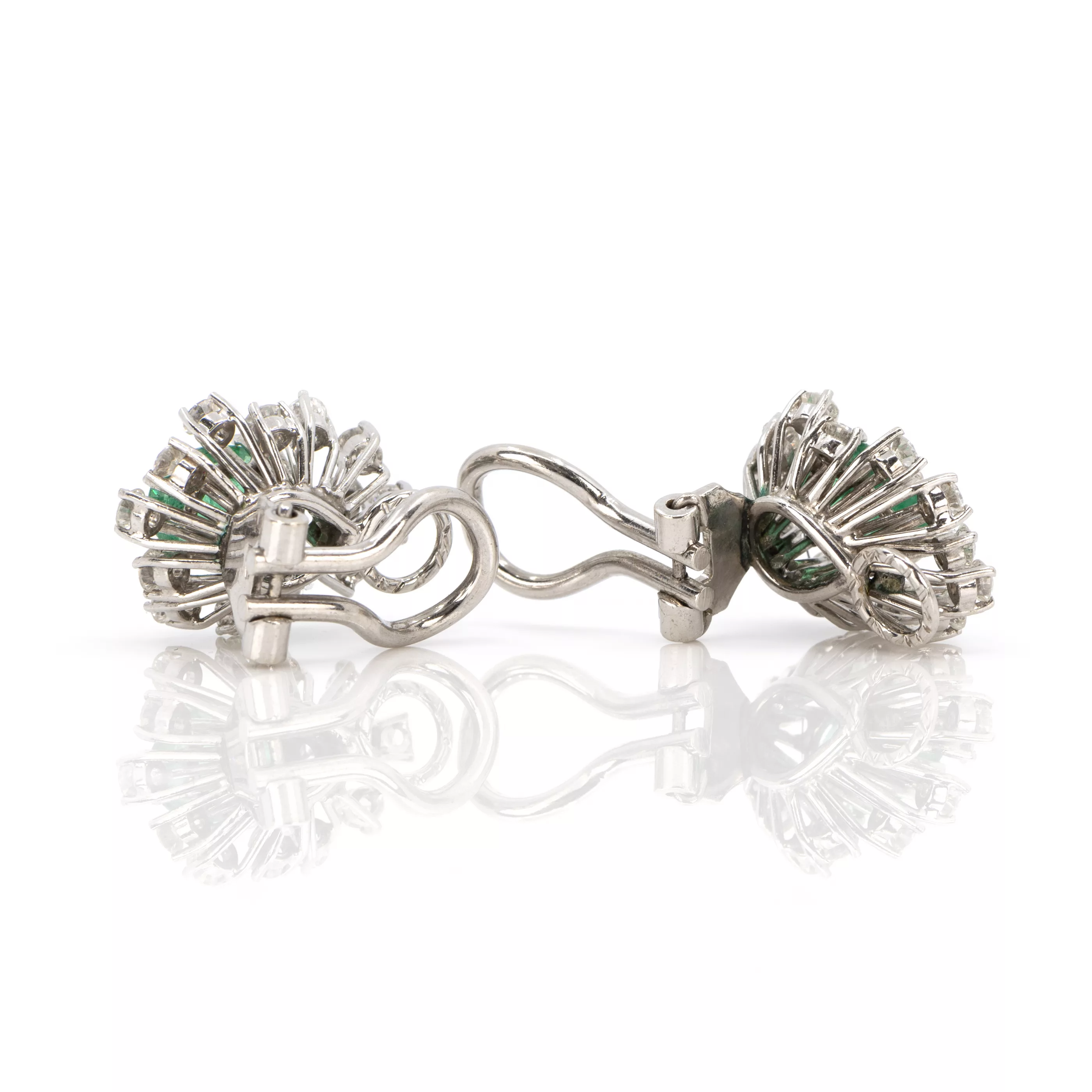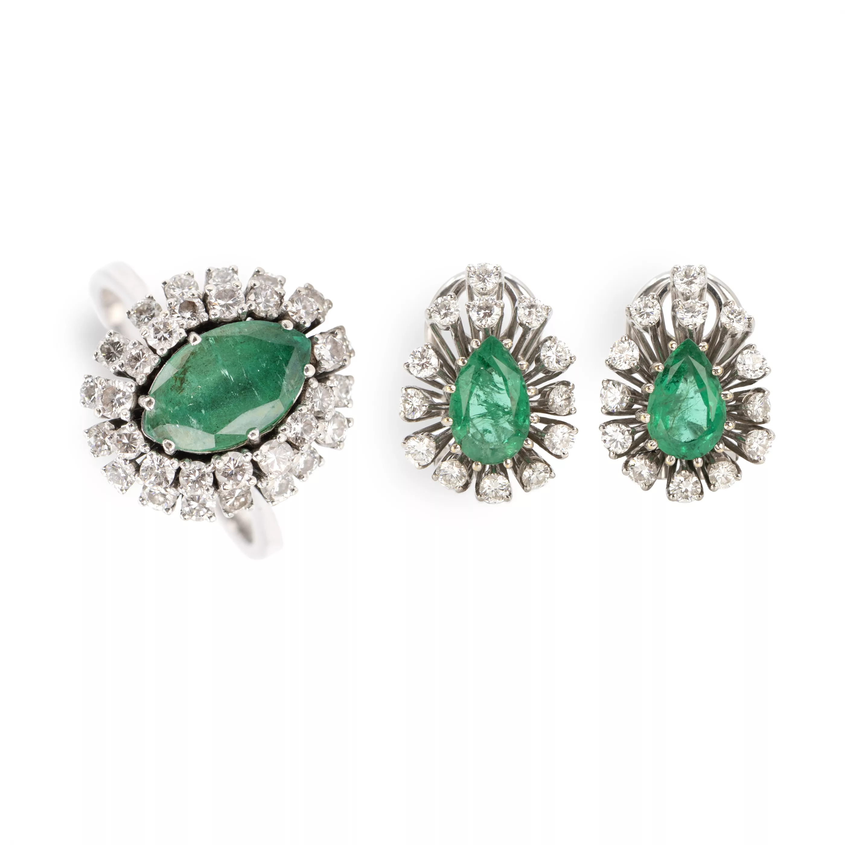 3-tlg., 750 Weißgold, punziert, die Ohrclips gesamt mit 26 Diamanten im Brillantschliff, gesamt ca. 1,04 ct, der Ring mit 32 Diamanten im Brillantschliff, gesamt ca. 1,30 ct, H, si, die Ohrclips mit je einem Smaragd im Tropfenschliff, gesamt ca. 1,92 ct, der Ring mit einem Smaragd im Marquiseschliff, ca. 2,00 -2,20 ct, RW 60, Gesamtgewicht ca. 16,8 g, Smaragd des Rings mit kleineren Tragespuren