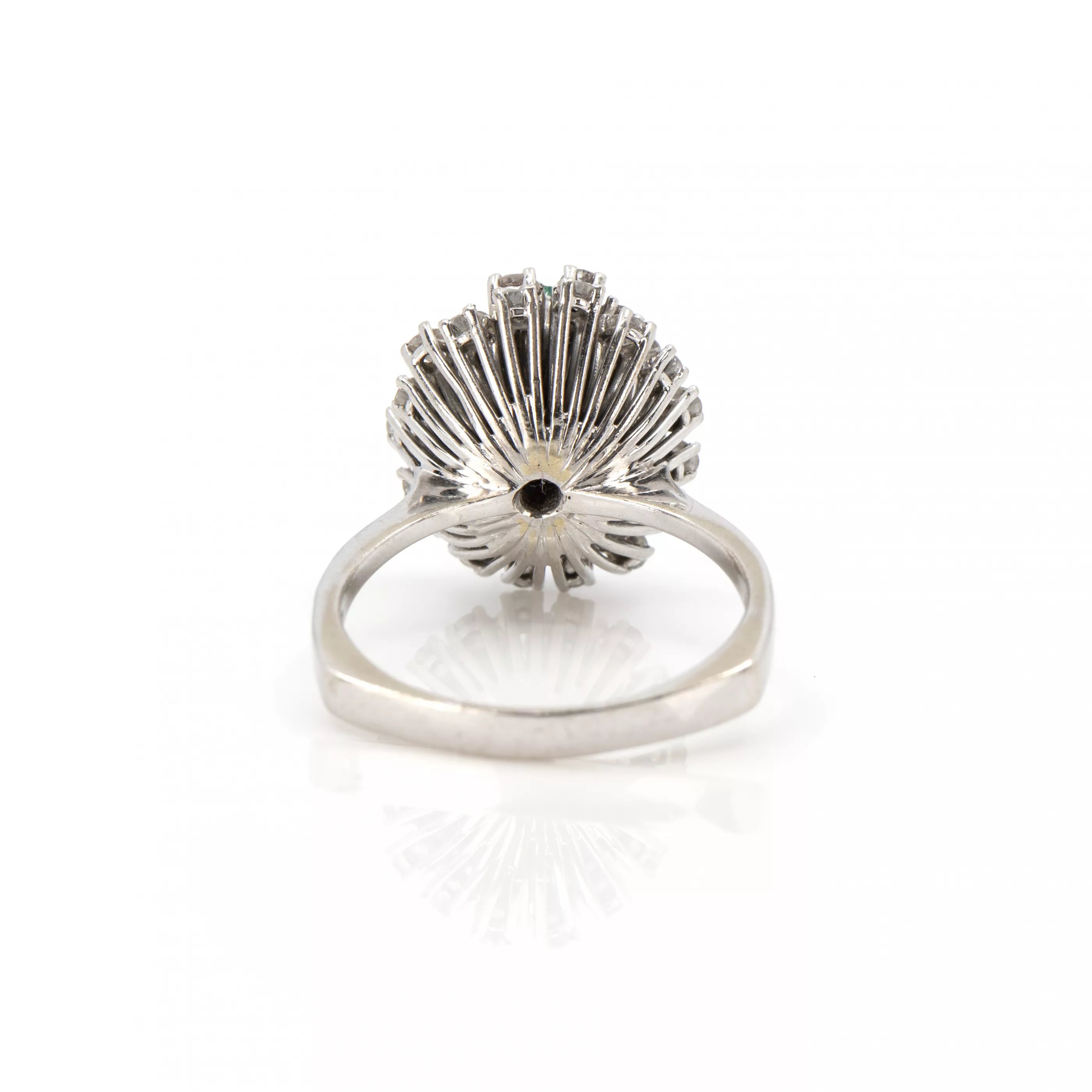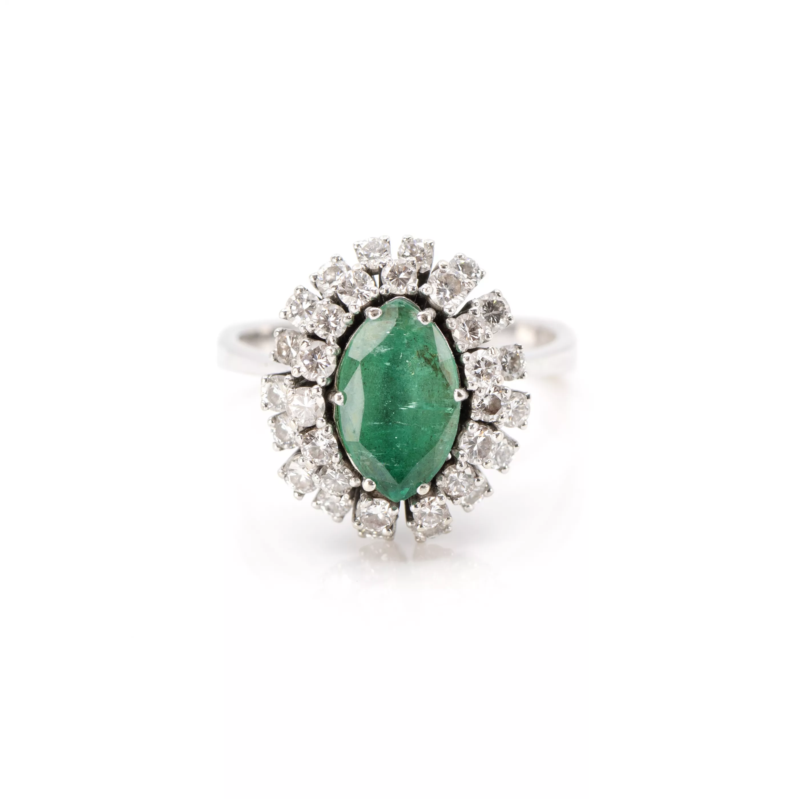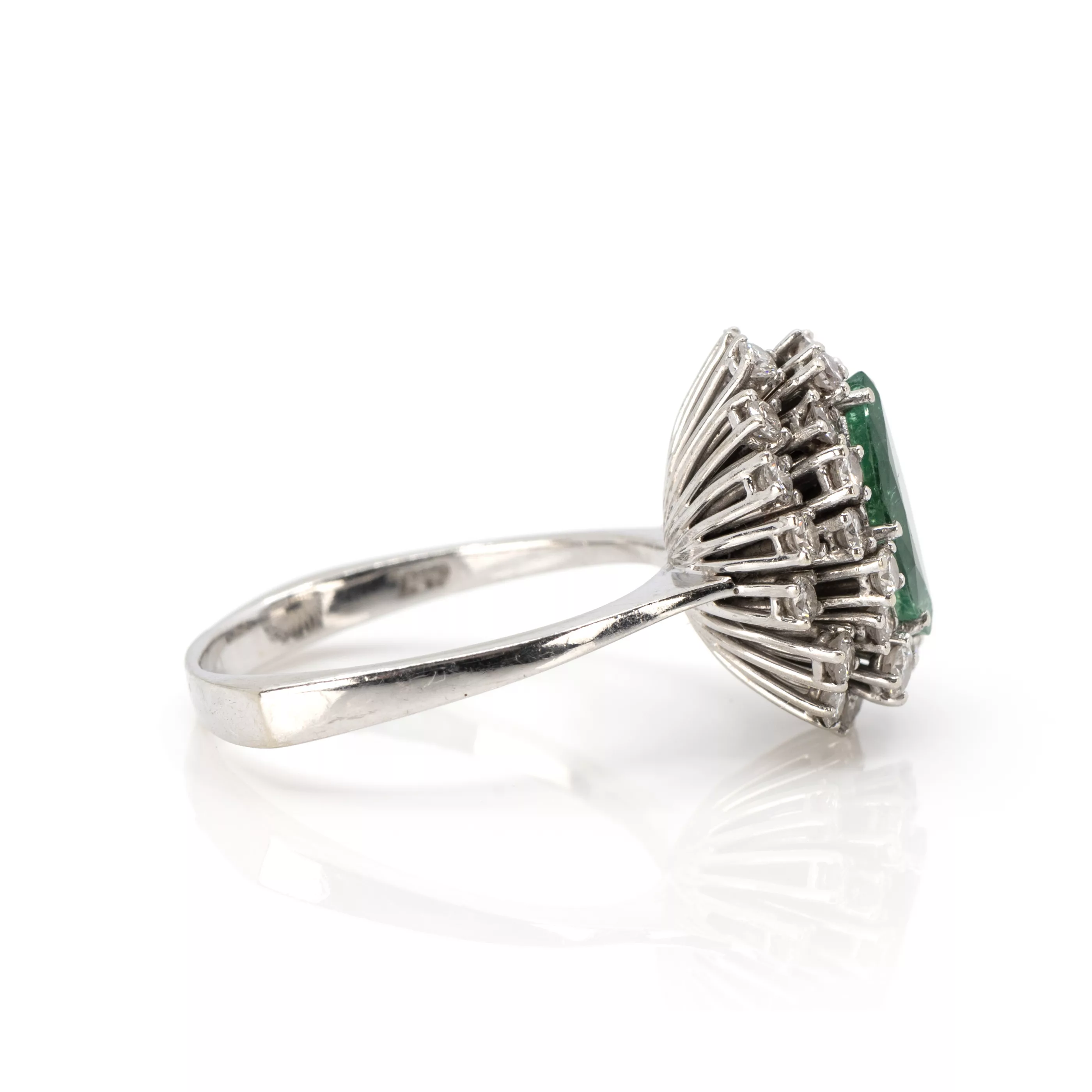 3-piece, 750 white gold, hallmarked, the earclips with a total of 26 brilliant-cut diamonds, total approx. 1.04 ct, the ring with 32 brilliant-cut diamonds, total approx. 1.30 ct, H, si, the earclips each with a drop-cut emerald, total approx. 1.92 ct, the ring with a marquise-cut emerald, approx. 2.00 - 2.20 ct, RW 60, total weight approx. 16.8 g, emerald of the ring with minor traces of wear