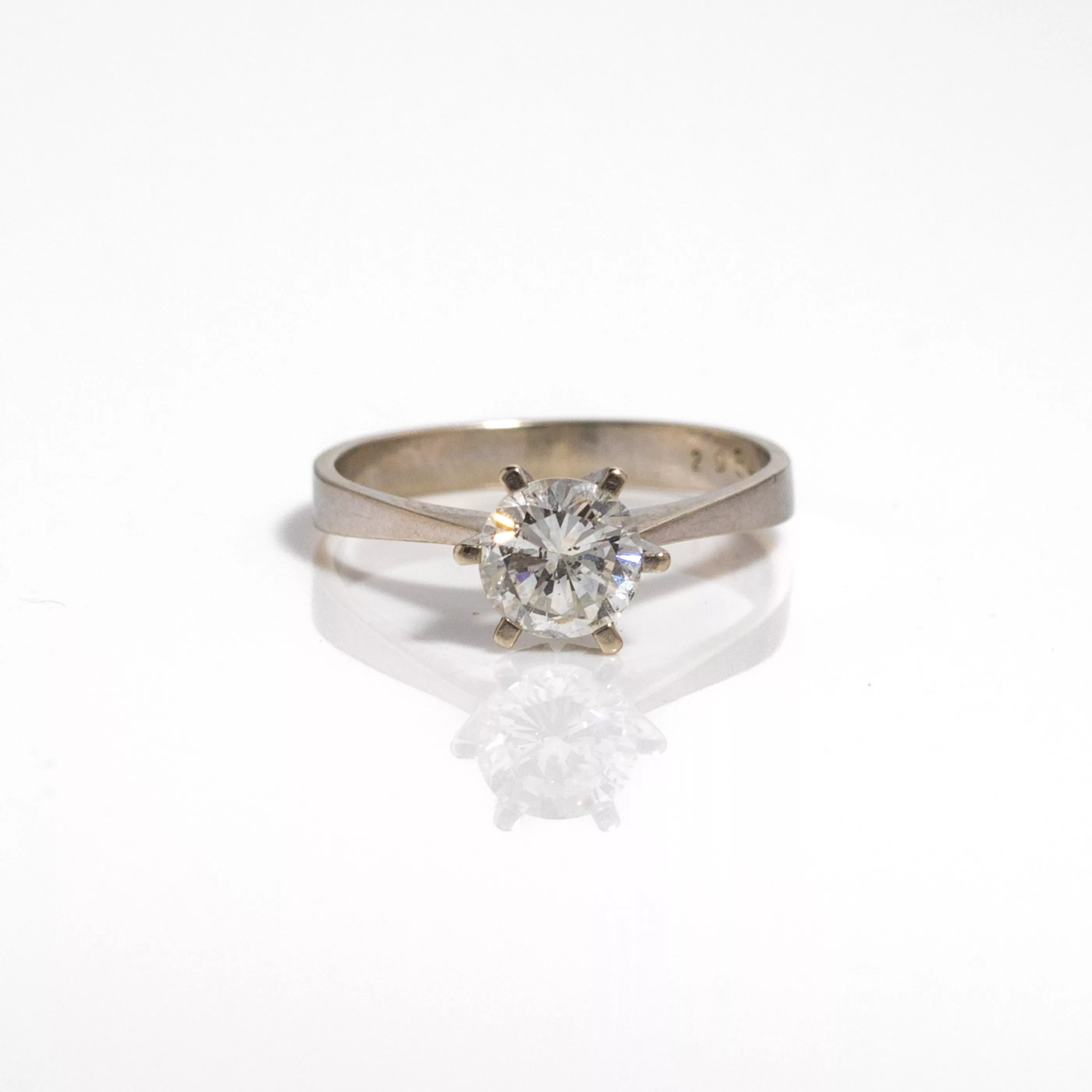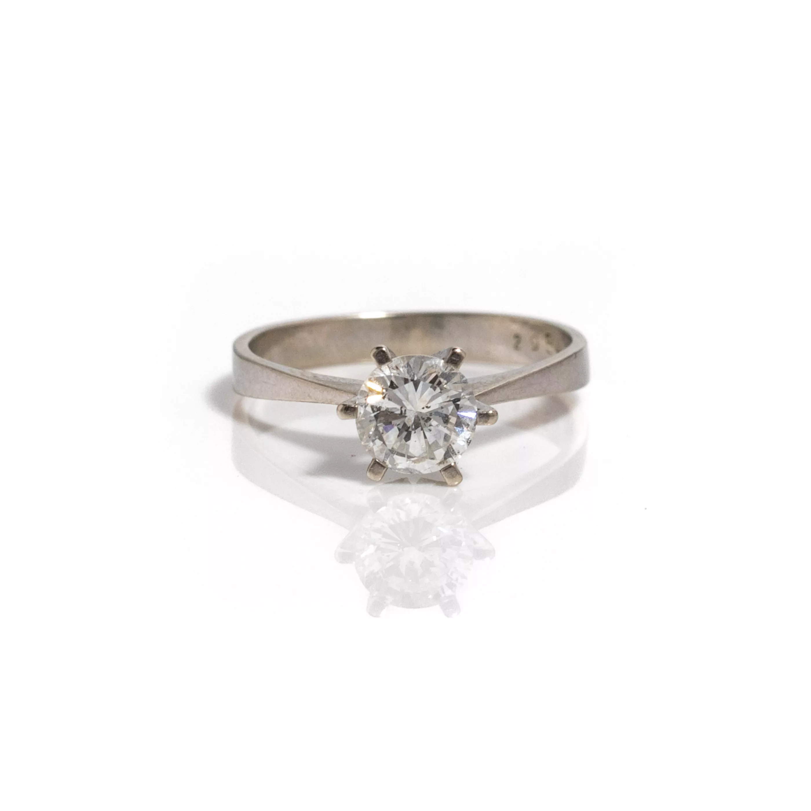 585 Weißgold, punziert, besetzt mit einem Diamanten im Brillant-Schliff, ca. 0,65 ct, H, SI2 - P, Ringgröße 57, Gesamtgewicht ca. 3