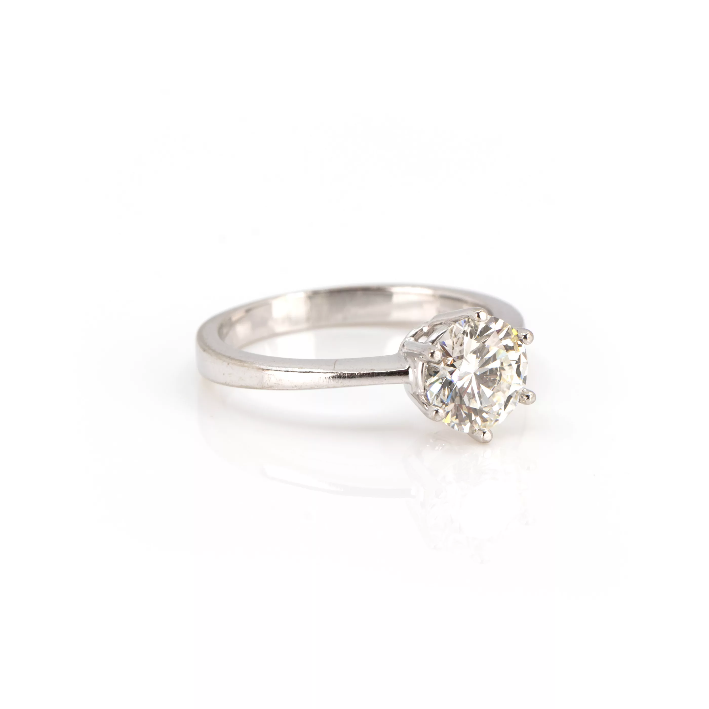 750 Weißgold, punziert, Diamant im Brillantschliff, 1,36 ct, I, vs2, Proportionen sehr gut, Schliffausführung sehr gut, Fluoreszenz leicht, RW 53, Gewicht ca. 3,9 g, DPL Expertise von 2006 anbei
