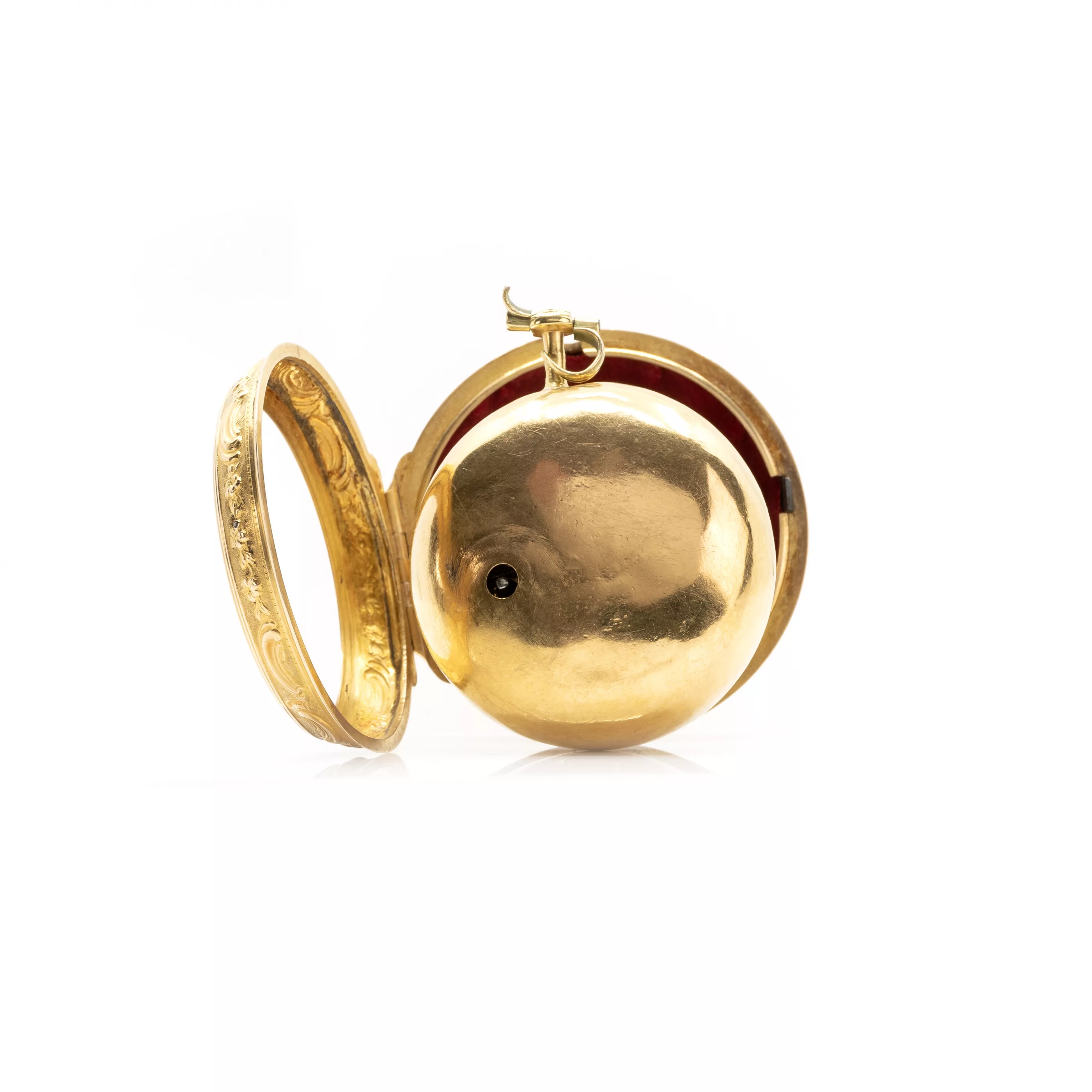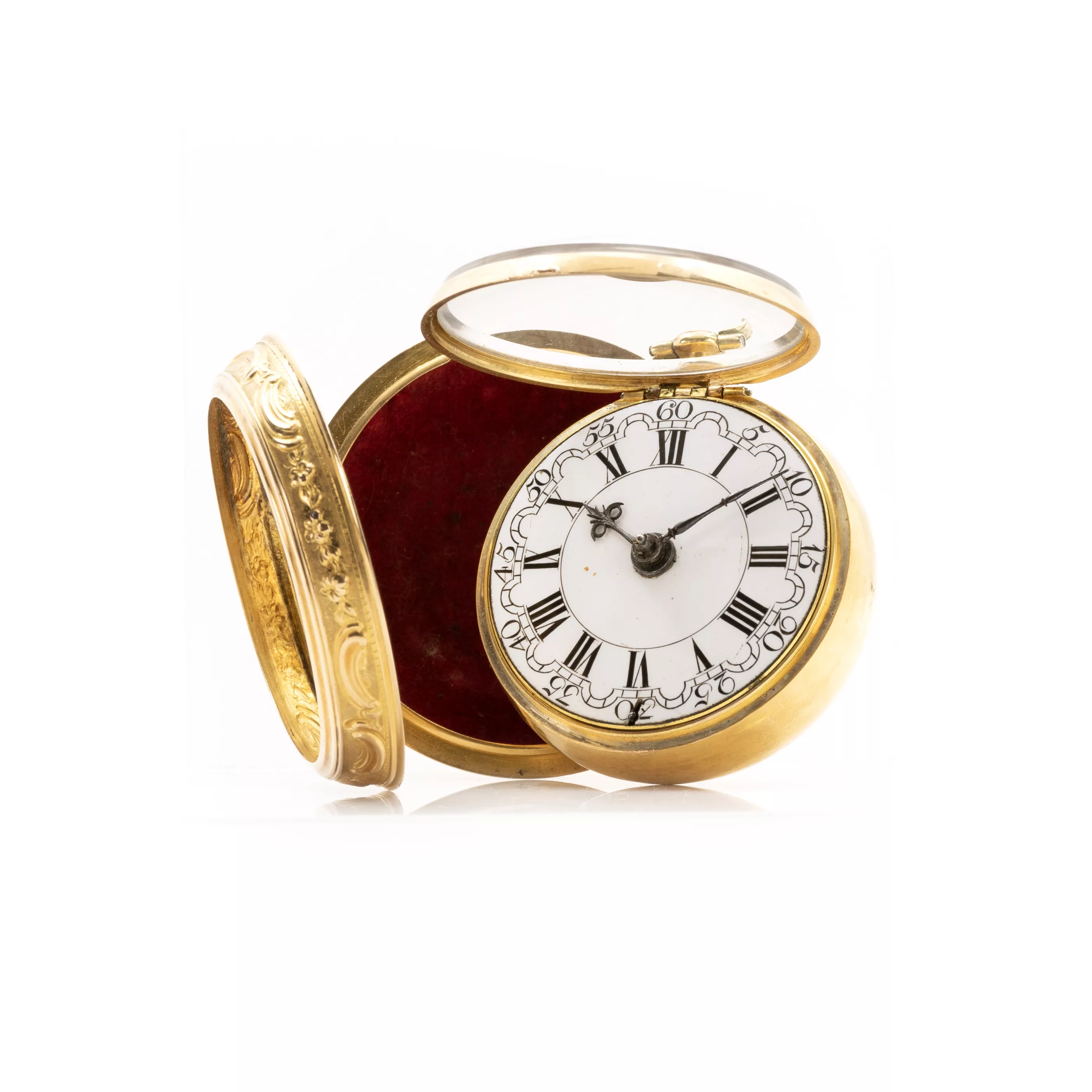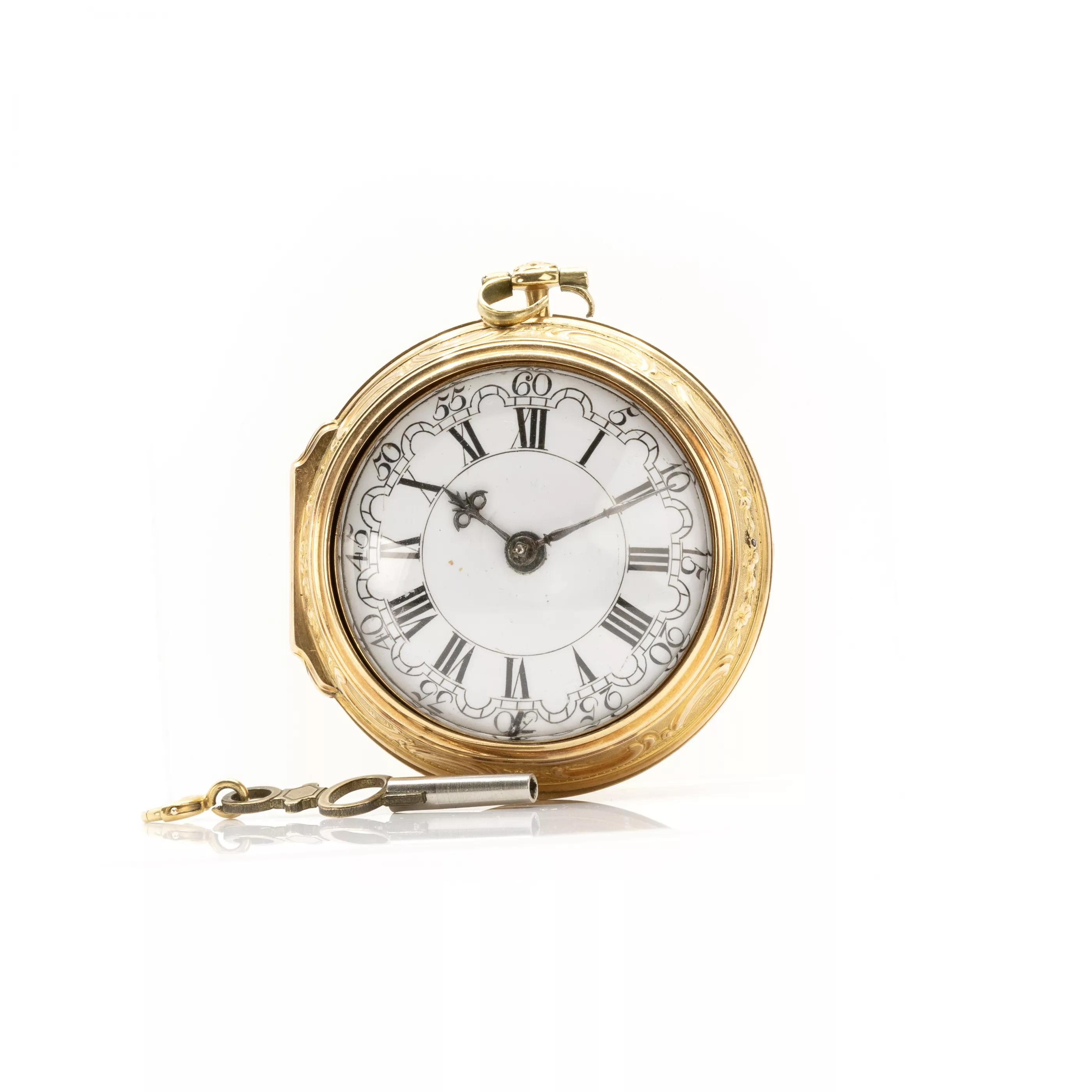 England, London, 1757, vergoldetes Werk mit Schlüsselaufzug, Schnecke und Kette, Gehäuse 750 Gelbgold, geprüft, Feingehaltspunze, Stadtmarke, Jahresbuchstabe und Herstellerpunze HT, Uhrengehäuse 750 Gelbgold, geprüft, getrieben und graviert, Werk-Nr. 6197, weißes Emaille-Zifferblatt mit schwarzen römischen Stunden und Minuterie, feiner, flächendeckender, teilw. erhabener Reliefdekor mit Figurenstaffage, Durchmesser mit Gehäuse 50 mm, Gewicht ca. 108 g, Funktion geprüft, gangbar, revisionsbedürftig, Zustand gut/befriedigend, Henkel defekt, Zifferblatt mit Fleck, 1 Schlüssel anbei