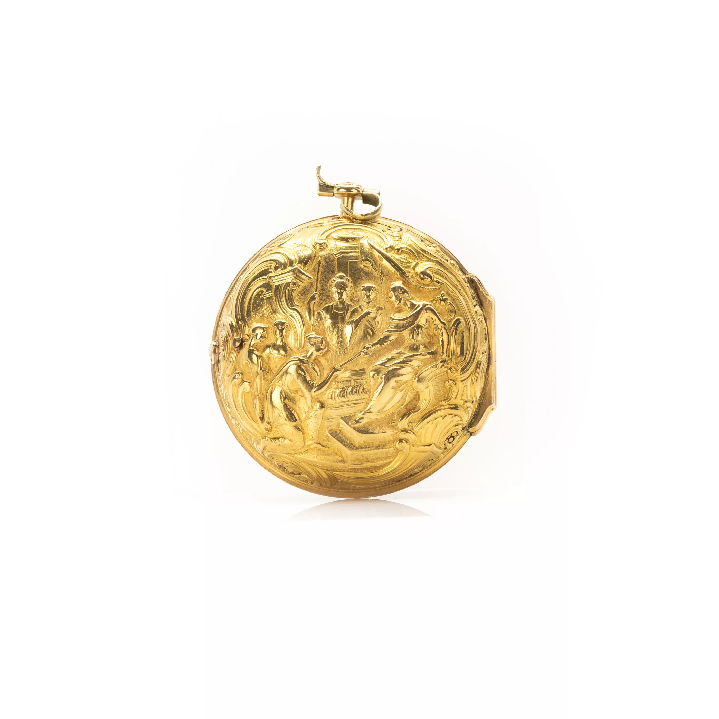 England, London, 1757, gilt movement with keywind, fusee and chain, case 750 yellow gold, tested, hallmark, town mark, year letter and maker's mark HT, watch case 750 yellow gold, tested, chased and engraved, movement no. 6197, white enamel dial with black Roman hours and minute scale, fine, extensive, partly raised relief decoration with figural staffage, diameter with case 50 mm, weight approx. 108 g, function tested, working, in need of overhaul, good/satisfactory condition, handle defective, dial with stain, 1 key enclosed