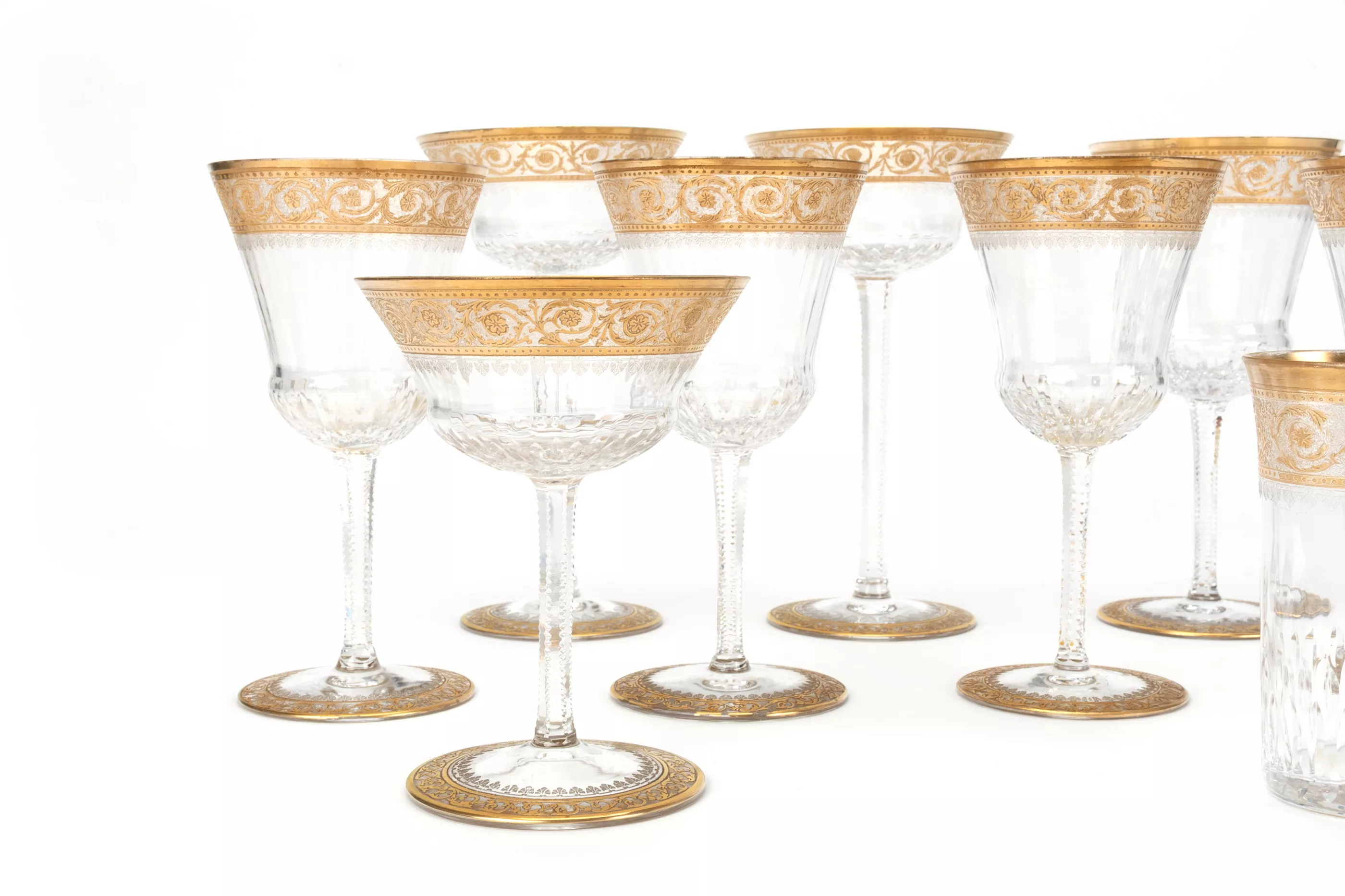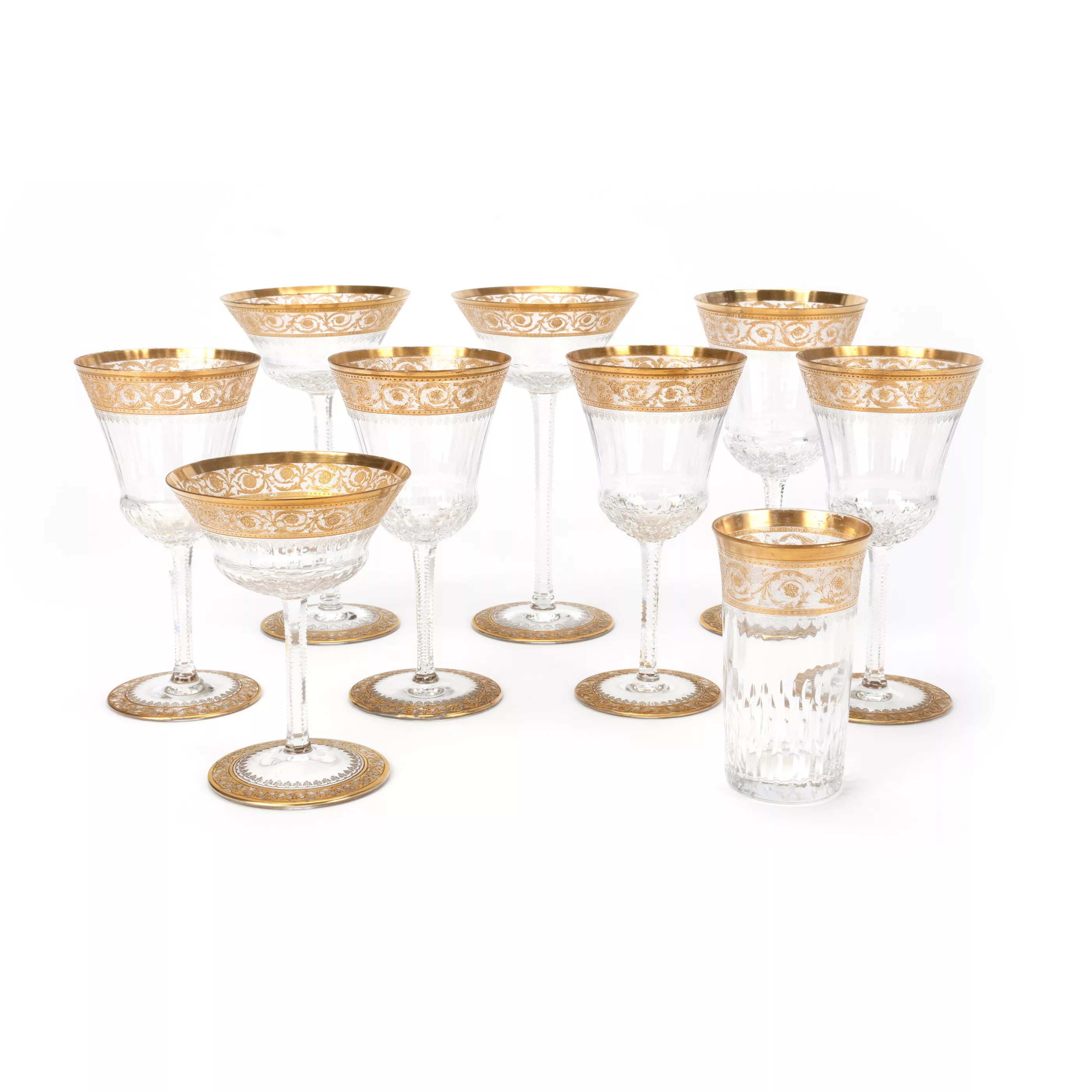 9-tlg., St. Louis, Frankreich, vermutlich spätes 19. Jh./frühes 20. Jh. (da keine Ätzmarke), handgeschliffenes Kristallglas, vergoldet, 4 Weißweingläser H 16,4 cm, 1 Rotweinglas H 18 cm, 1 Likörglas H 13 cm, 2 Champagnerschalen H 18 cm, 1 Wasserglas H 11 cm, Zustand B/C, mit Alters- und Gebrauchsspuren, partiell Goldabrieb