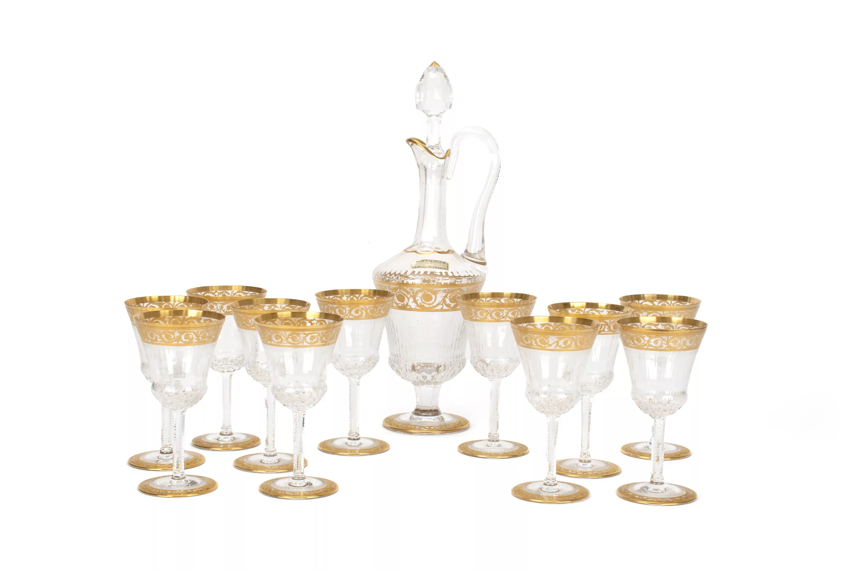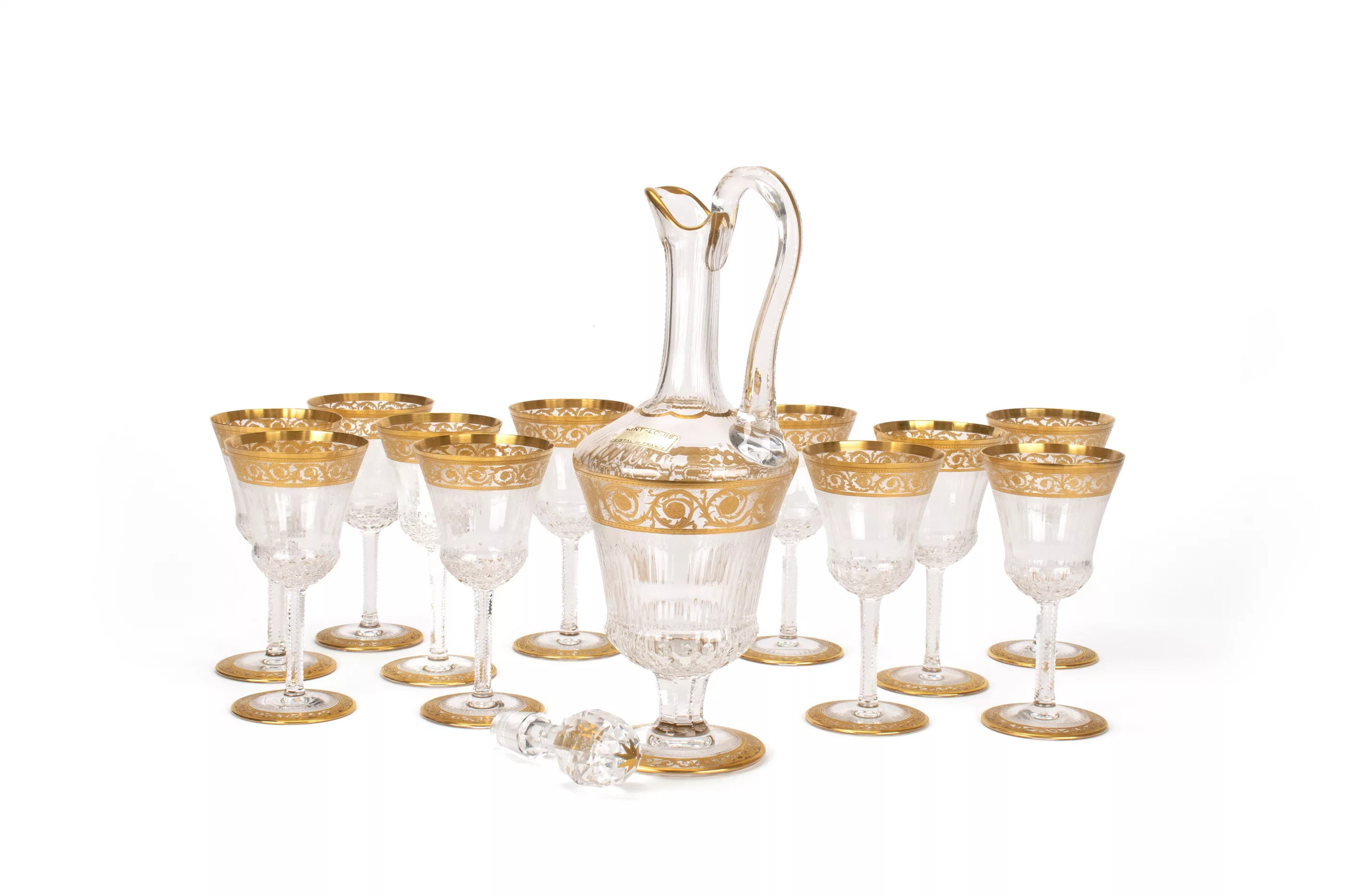 12-piece set, St. Louis, France, wine glasses model hand-blown, hand-cut crystal glass, gold-plated, 11 wine glasses height 16 cm, 1 wine carafe 41 cm (with stopper), wine glasses each with etched mark on the underside, wine carafe with manufacturer's label, condition A/B, etched marks and manufacturer's label slightly rubbed off in places, minimal gold wear in places