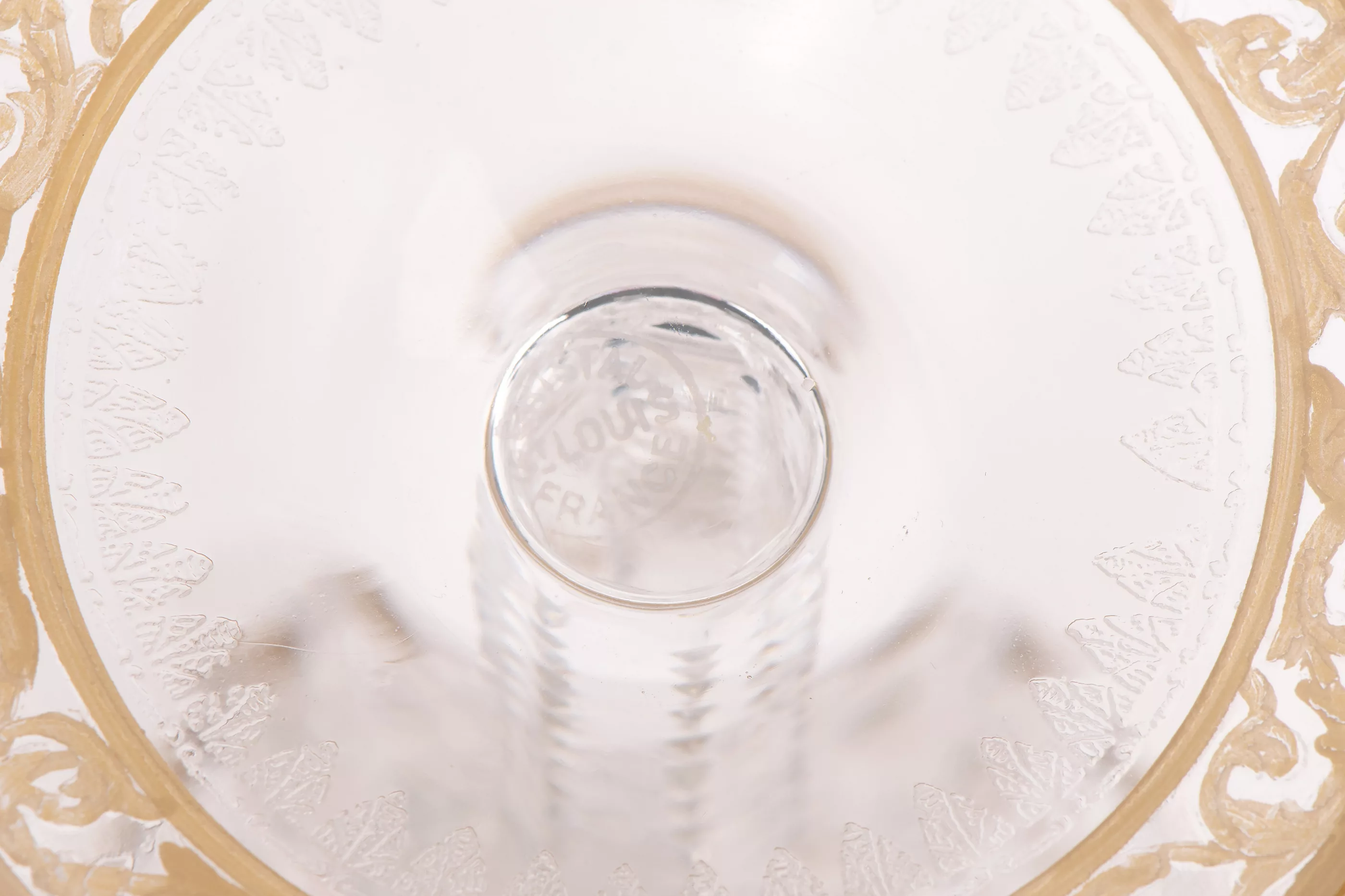 12-tlg., St. Louis, Frankreich, Weingläser Modell #3, mundgeblasenes, handgeschliffenes Kristallglas, vergoldet, 11 Weingläser Höhe 16 cm, 1 Weinkaraffe 41 cm (mit Stöpsel), Weingläser unterseitig jeweils mit Ätzmarke, Weinkaraffe mit Manufakturaufkleber, Zustand A/B, Ätzmarken und Manufakturaufkleber teilweise leicht abgerieben, partiell minimaler Goldabrieb