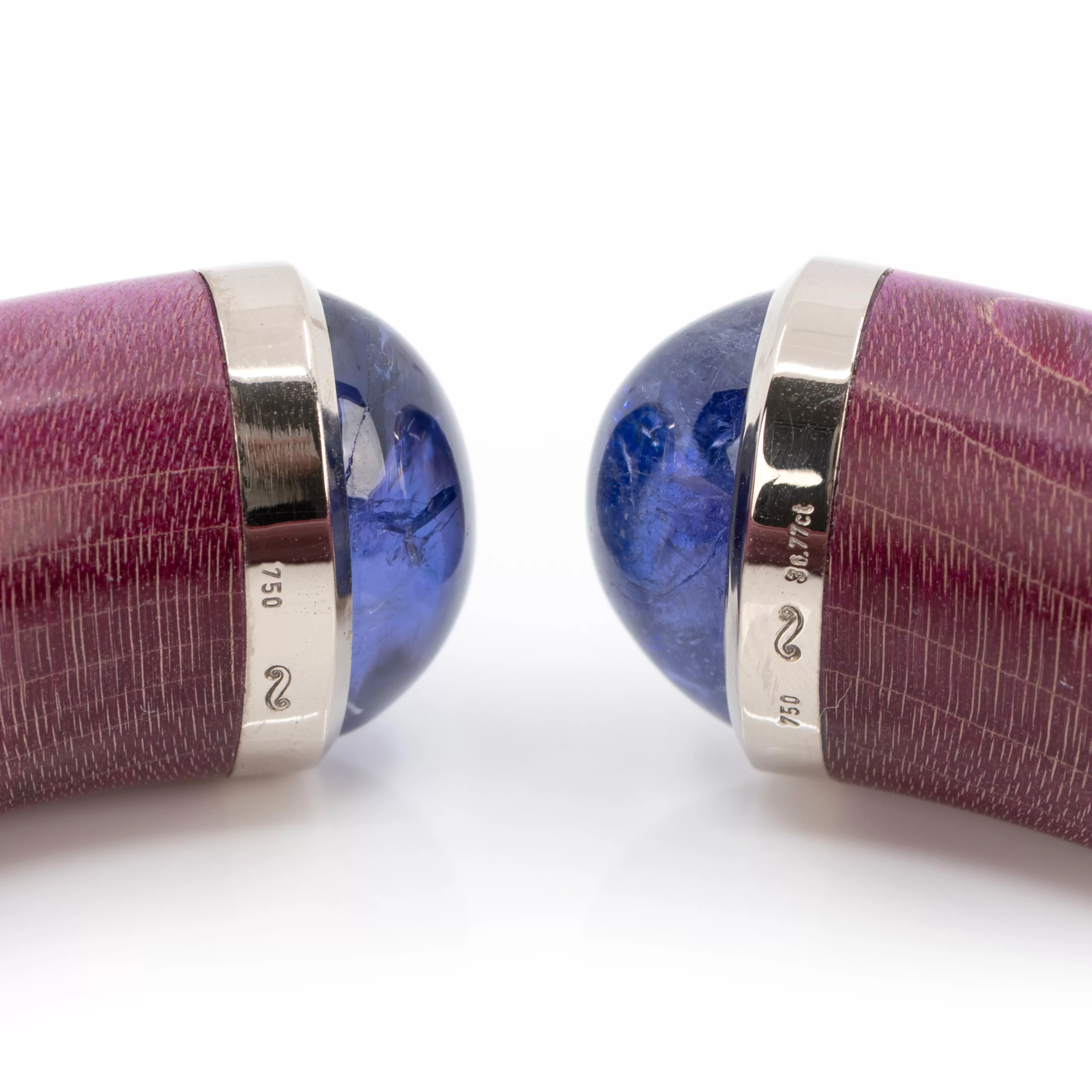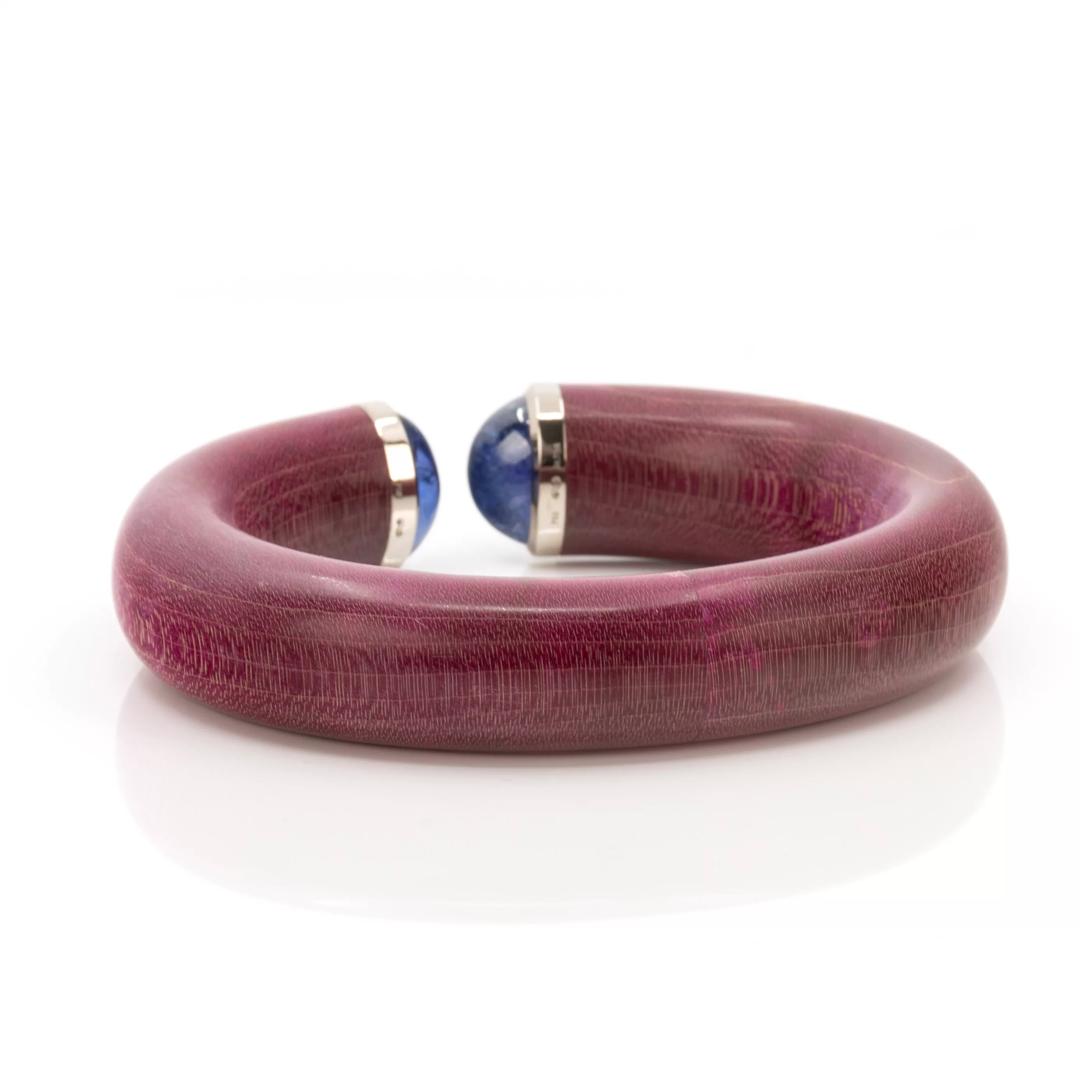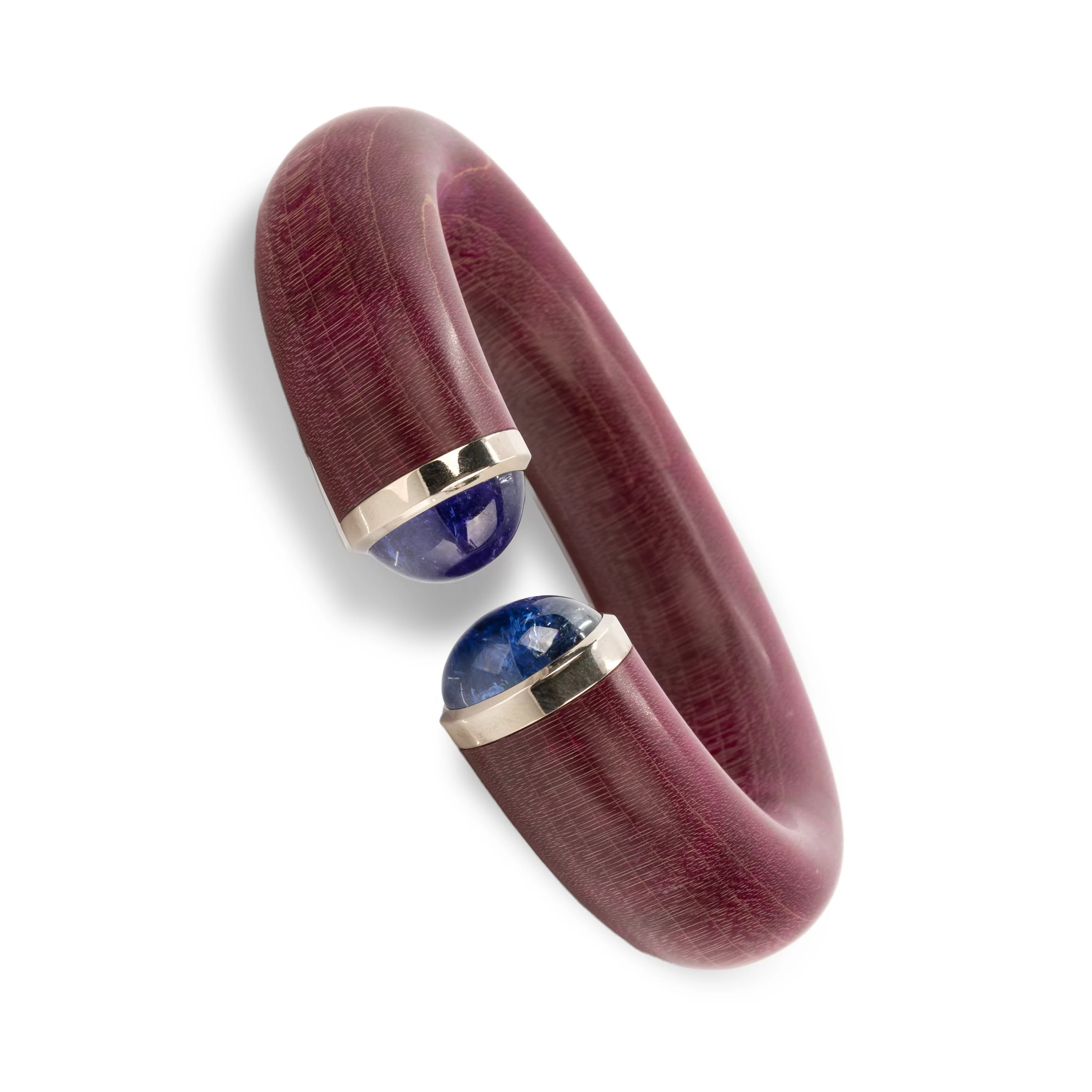 Carsten Fischer, Essen, Abschlüsse 750 Weißgold, punziert, dazu Goldschmiedepunze, Reif aus Ahorn, pink-violett gefärbt, das offen gearbeitete Mittelstück mit 2 Tansanit-Cabochons, gesamt 36,77 ct, gestempelt, Ø innen 6,5 cm, der Reif lässt sich zur Seite aufdrehen, Gewicht ca. 77,7 g