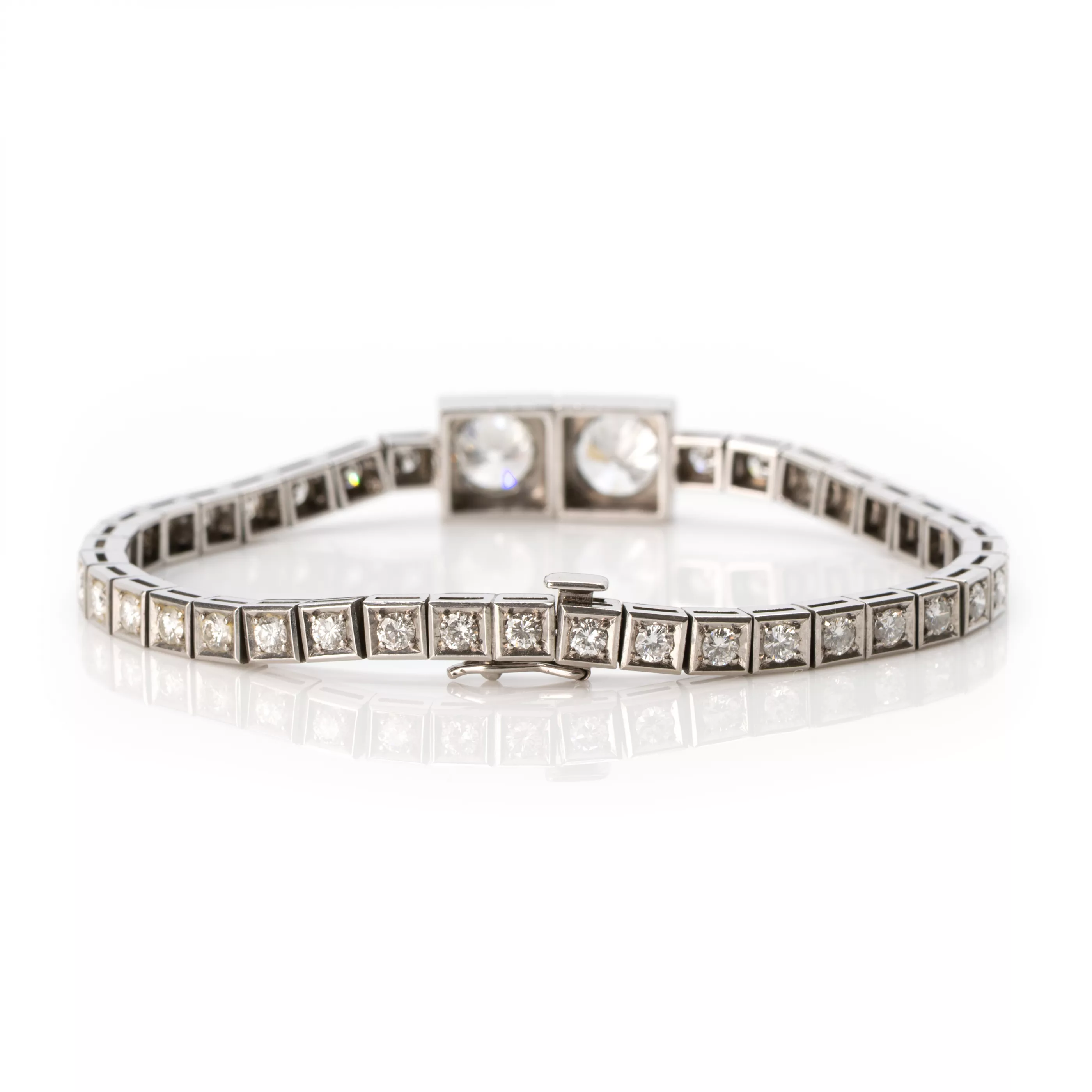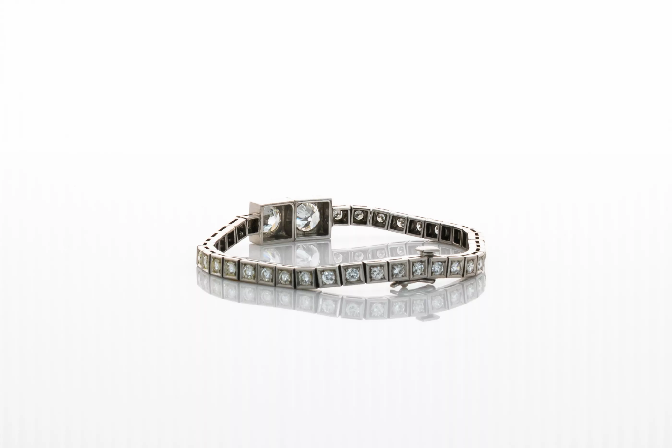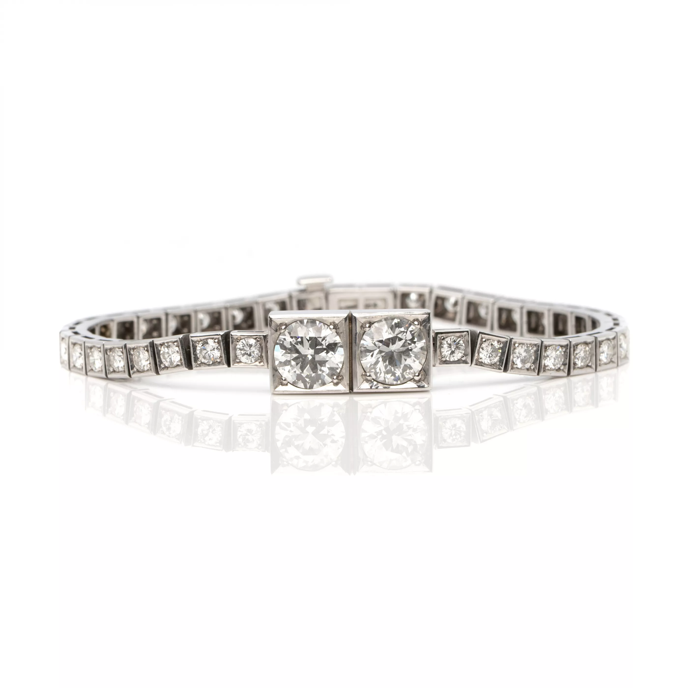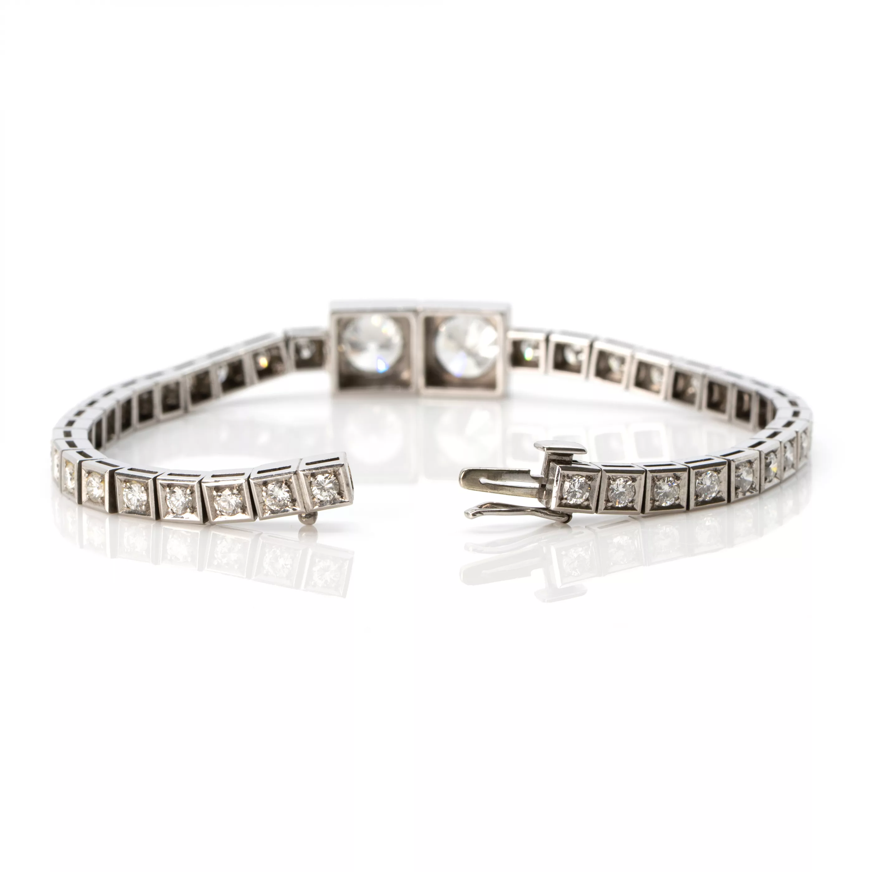 750 Weißgold, punziert, 2 Diamanten im Altschliff, zus. ca. 2,70 ct, H, VSI-SI, umgeben von 37 Brillanten, ca- 2 ct, H, VS - SI, Länge 17,3 cm, Gesamtgewicht ca. 20,8 g