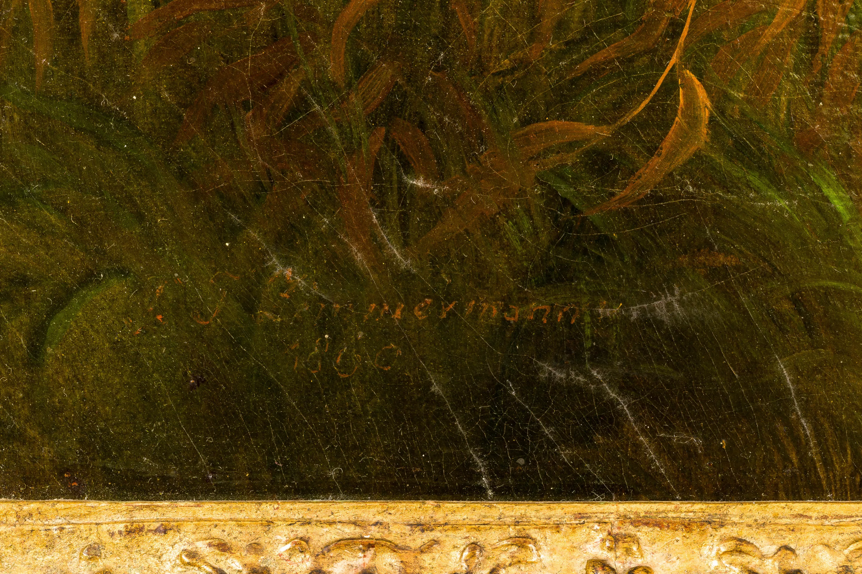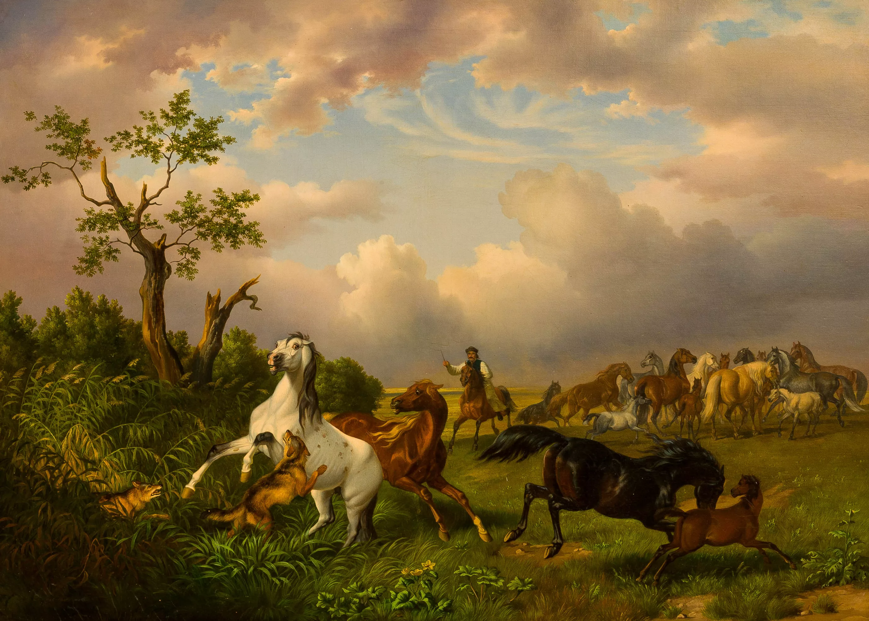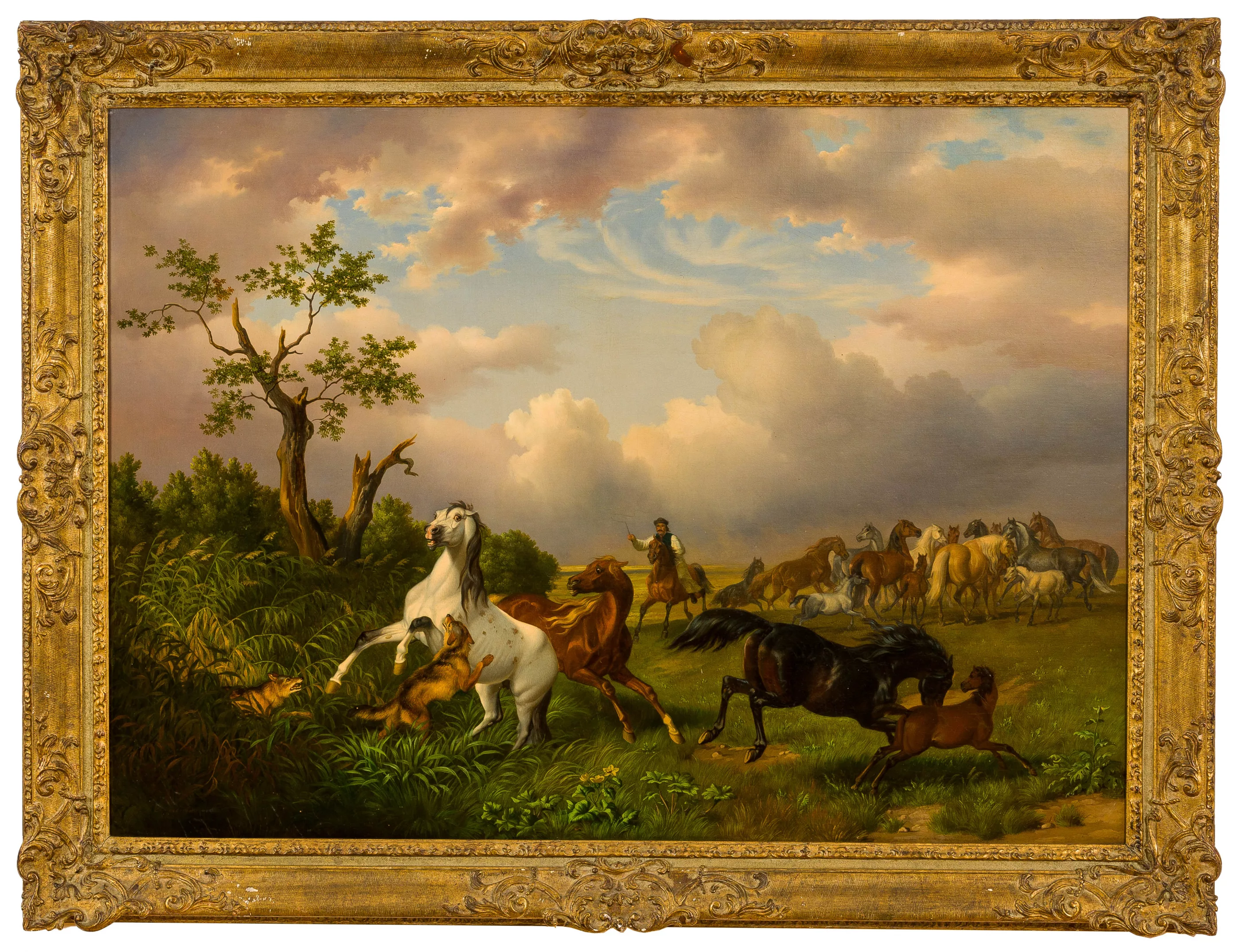 Horses threatened by wolves, oil on canvas, 73,5 cm x 100 cm, signed, 1860 dated, relined, craquelures, partial paint chippings