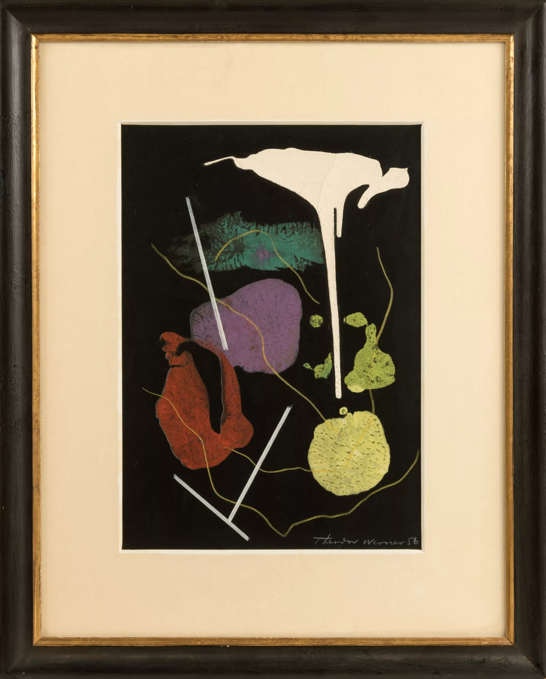 Abstract still life, mixed media on firm paper, 34.5 cm x 24 cm visible dimensions, signed, dated 56, mounted, white surface slightly craquelled, partially slightly rubbed on the surface