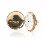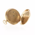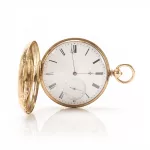 London, circa 1850, keywind, enamel dial with Roman numerals, small seconds with Arabic numerals, case no. 10321, finely engraved 585 yellow gold case, hallmarked, metal intermediate cover, diameter 53 mm, total weight approx. 91.0 g, functional, tested, condition satisfactory, small restored area on case cover, dial cracked, key absent, condition and functionality tested by our master watchmaker, note: The buyer's premium is 25% incl. VAT. For the use of the online bidding consoles there is an additional fee of 3% plus VAT (3.57%).