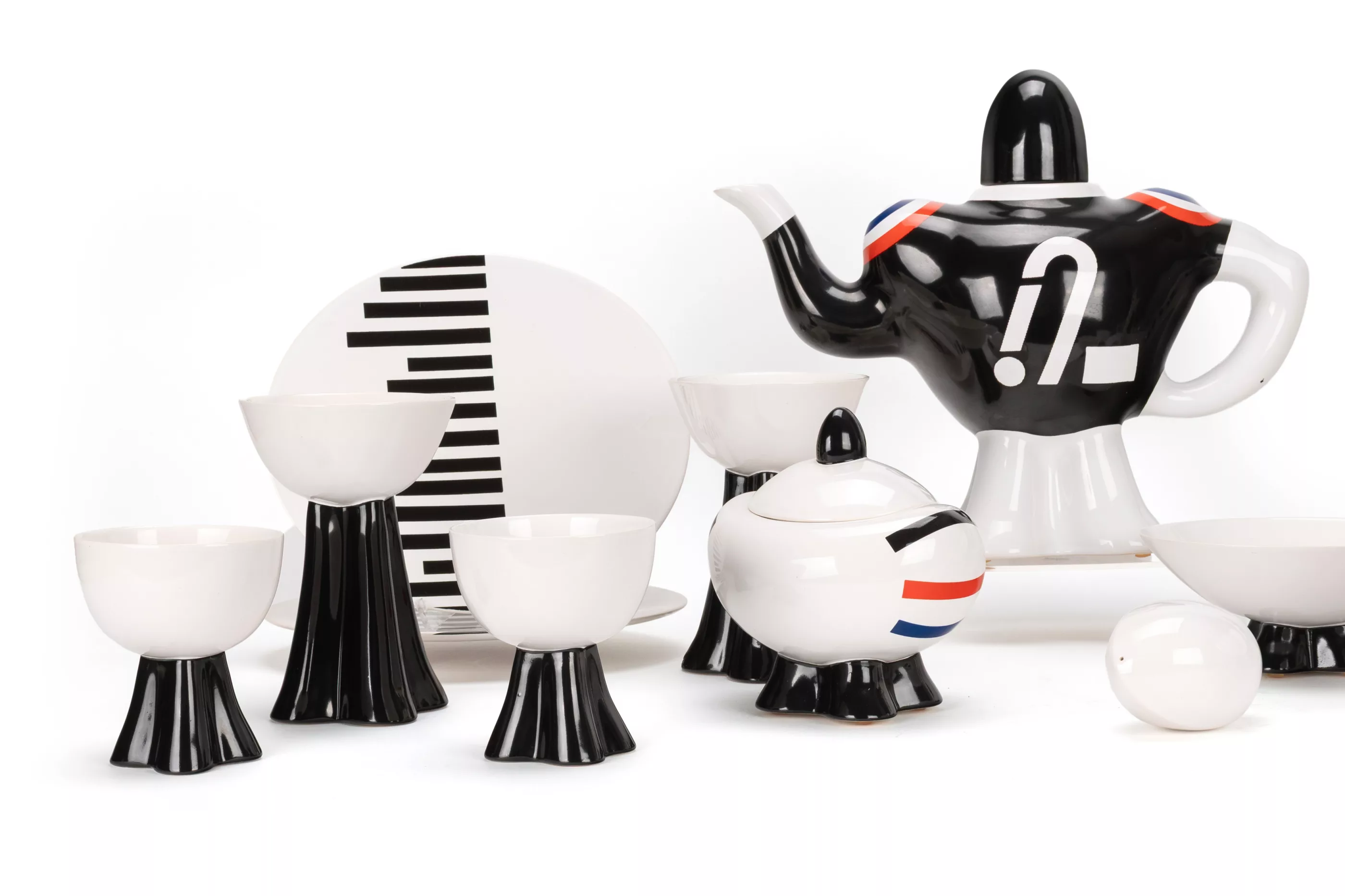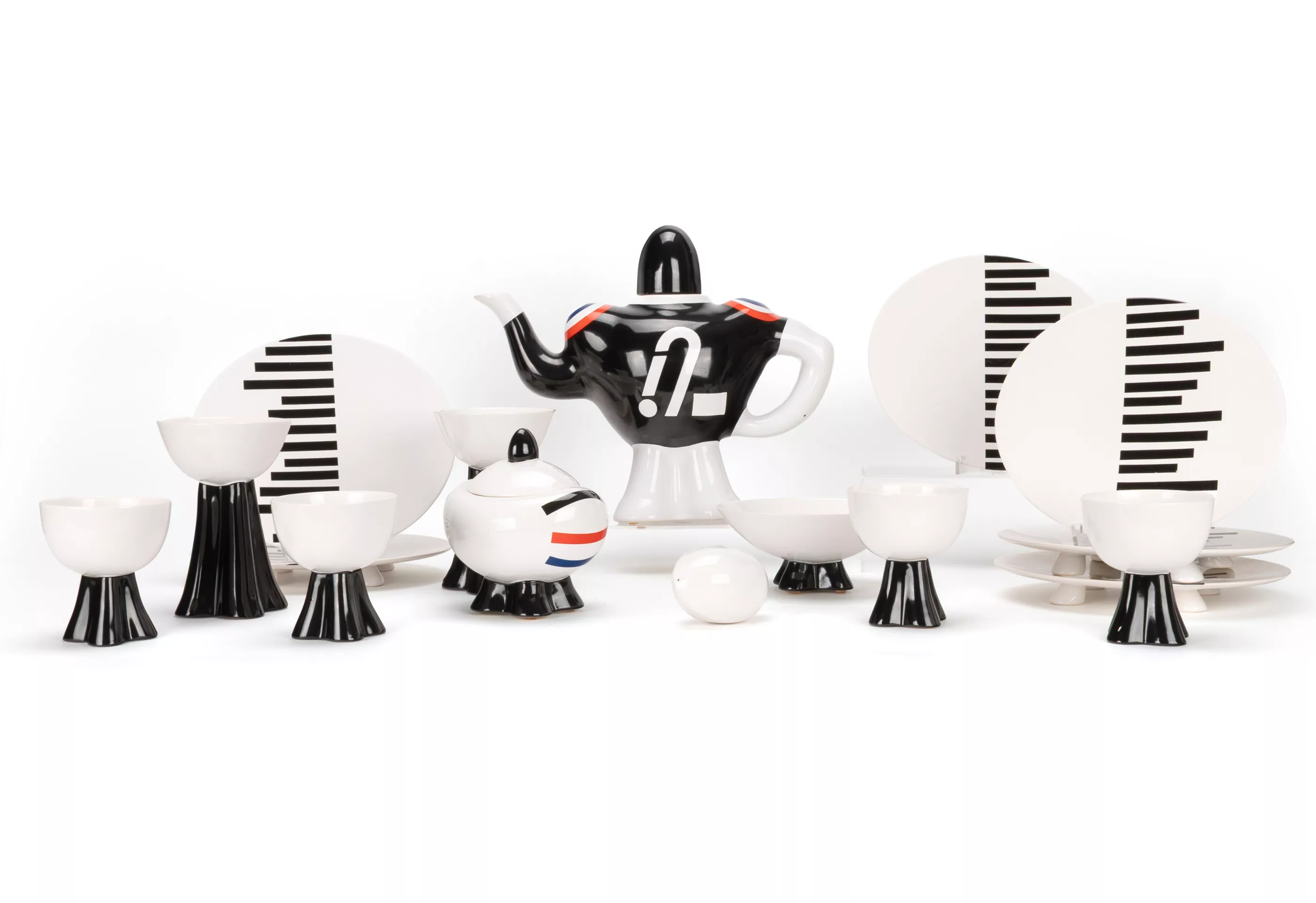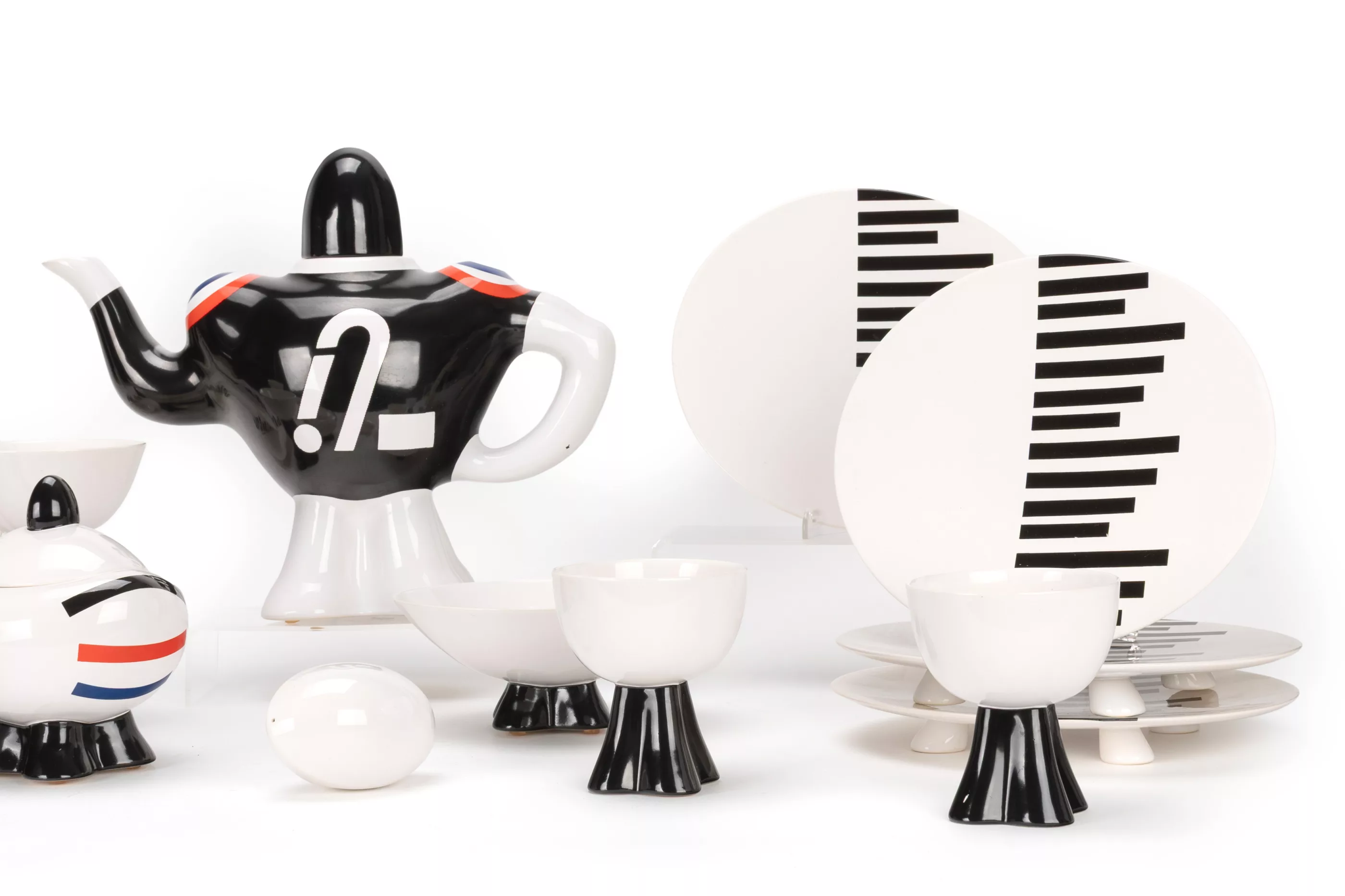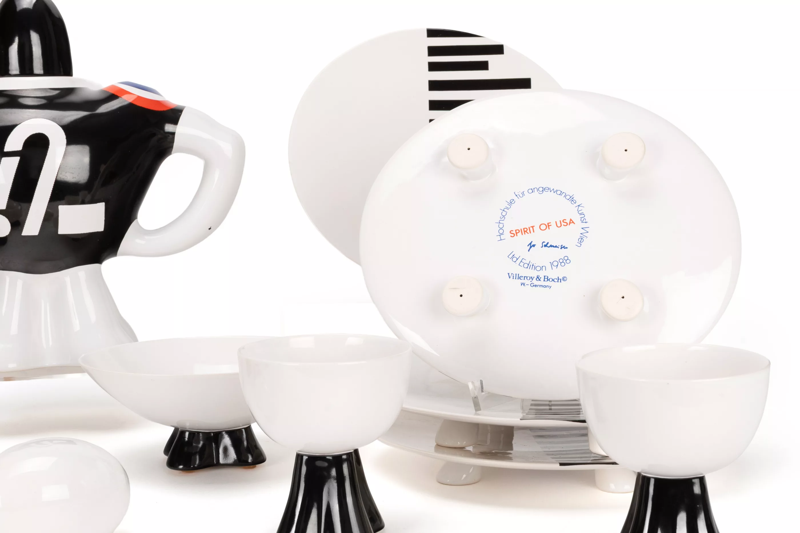 16-pcs, Villeroy & Boch, Mettlach, 1987/88, porcelain, white, partially coloured, breakfast service 'American Football' from the design project 'Spirit of the USA' by Villeroy & Boch in collaboration with the University of Applied Arts in Vienna, nine students of the master class for ceramics/product design under the direction of Prof. Dr. Mattheo Thun developed and produced their own tableware collection in a limited edition of a maximum of 50 pieces per series as unique pieces (as a rule, the number of 50 pieces was not reached). The 'American Football' service by designer Johanna Schmeiser (1967, Graz, Austria) was created under the motto 'American sport - the breakfast table as a playing field'. 1 coffee pot in the shape of a football player, H 25,5 cm, 6 cups or mugs, H 9.5 cm and 14.2 cm, 6 plates, 21.5 cm x 19 cm, 1 bowl, H 6.7 cm and a football, with manufacturer's mark and inscription on the underside, condition A, one plate with small production defect, catalogue enclosed