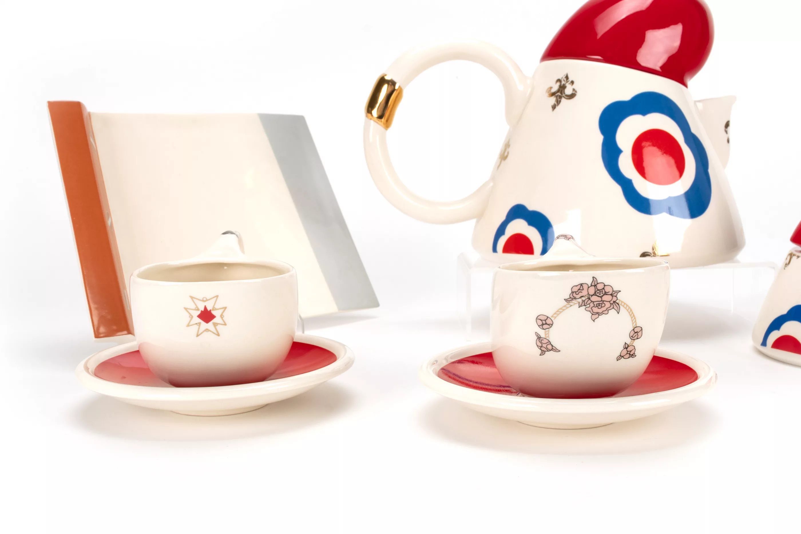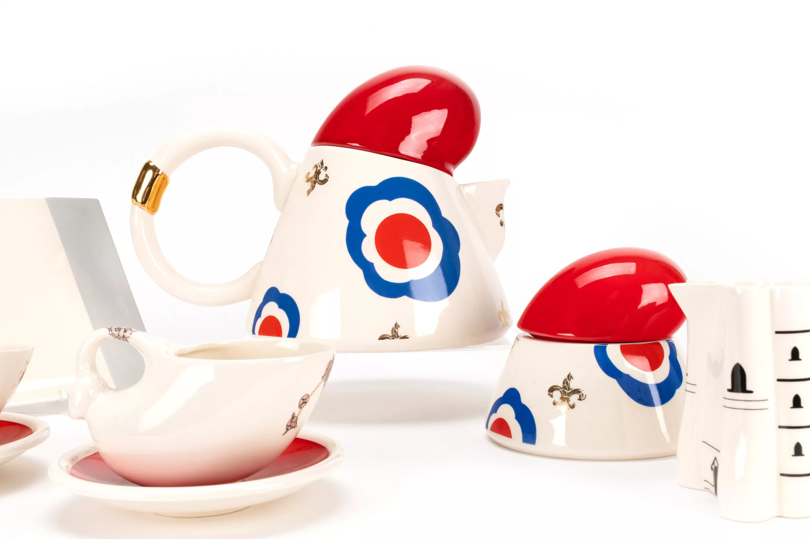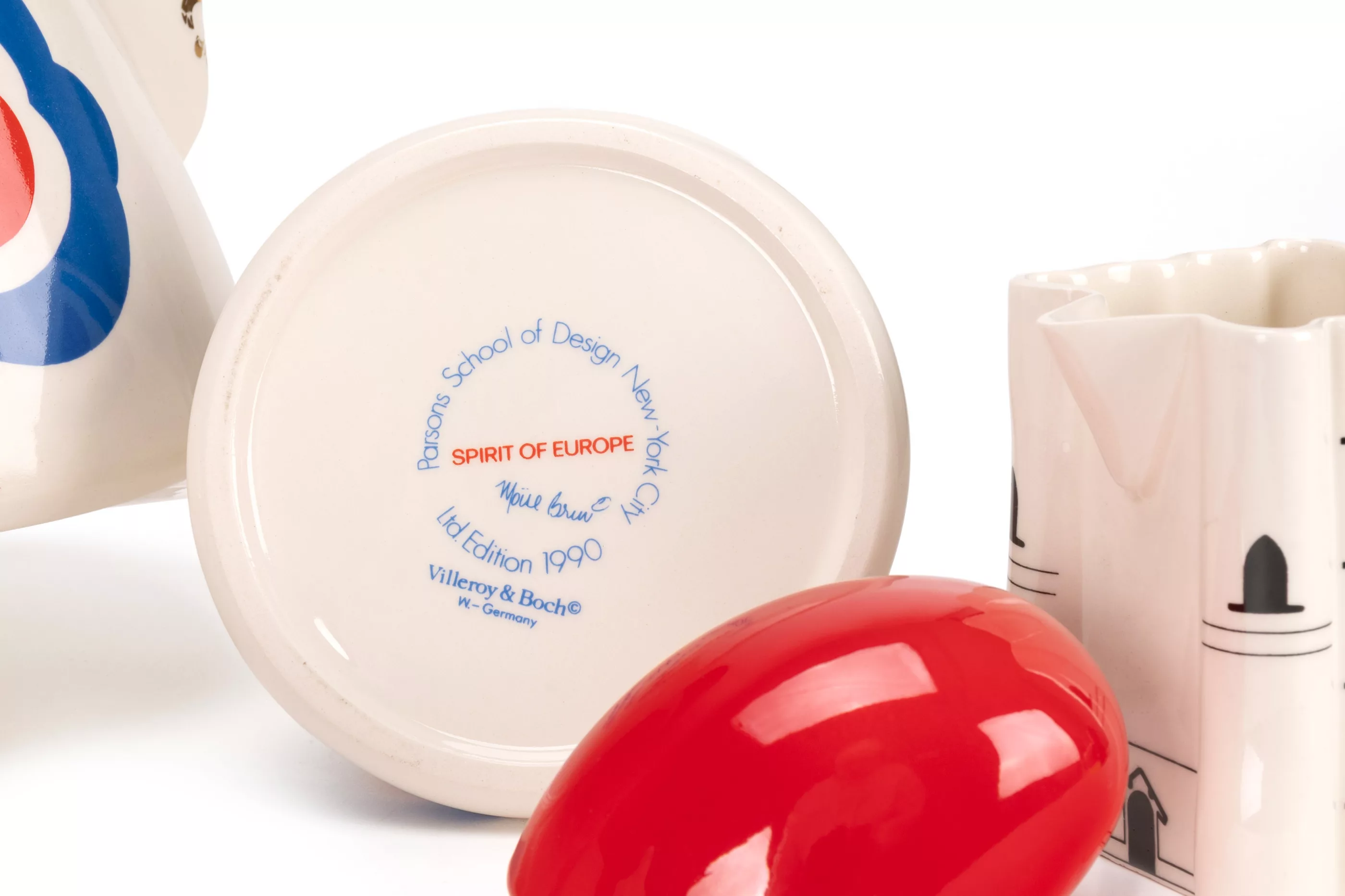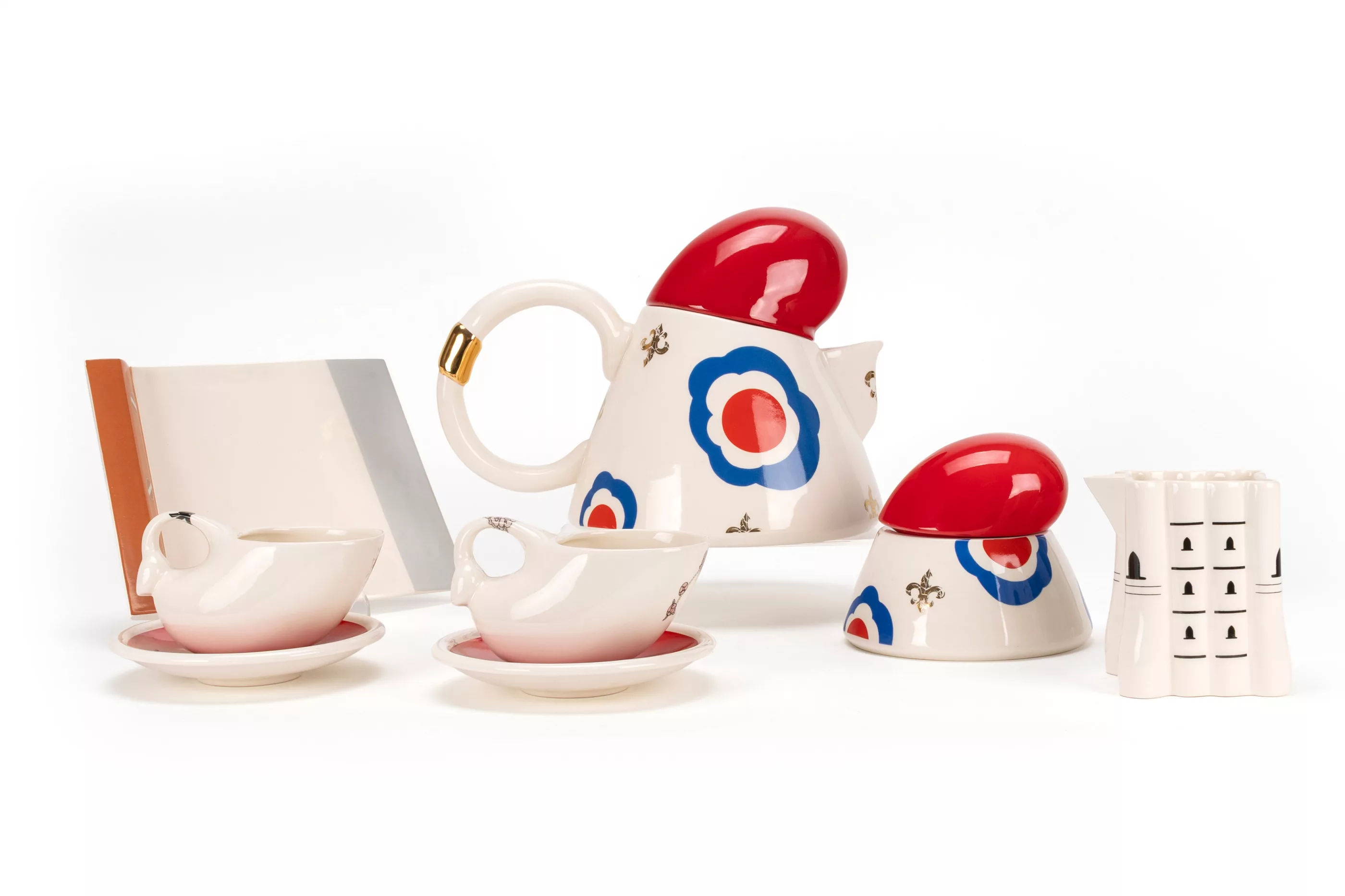 7- pcs, Villeroy & Boch, Mettlach, 1989/90, porcelain, white, coloured, partially decorated in gold, 'French Revolution' tea service from the 'Spirit of Europe' design project by Villeroy & Boch in collaboration with the Parsons School of Design in New York. Under the direction of Marek Cecula from the Ceramic Design Department, ten students from the design school produced and developed their own tableware collection in a limited edition of a maximum of 50 pieces per series as unique pieces (as a rule, the number of 50 pieces was not reached). The 'French Revolution' service by designer Moise Bruni pays homage to the French Revolution. 1 serving tray in the shape of a guillotine hatchet, 21 cm x 13.6 cm, 2 teacups in the shape of wigs on red saucers, H 6.5 cm, 1 jug with Jacobean cap, H 18 cm, 1 sugar bowl with Jacobean cap, H 10 cm and 1 milk jug in the shape of the Bastille, H 9 cm, with manufacturer's mark and inscription on the underside, condition A, catalogue and certificate enclosed