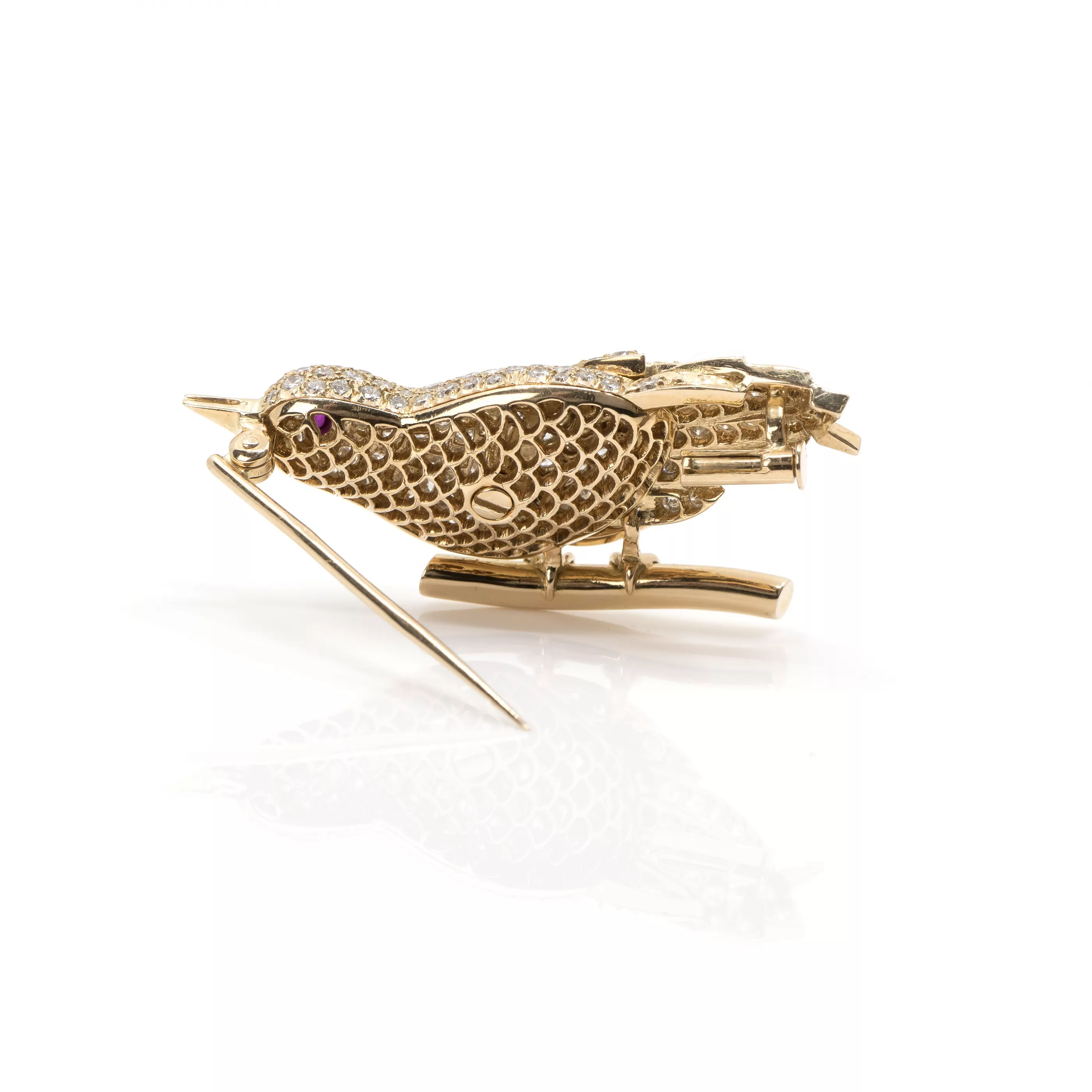 Vogelbrosche mit Brillantbesatz750 Gelbgold, geprüft, ca. 155 Diamanten im Brillantschliff, gesamt ca. 2,10 ct, F-G, vvs-vs, 1 Rubin als...