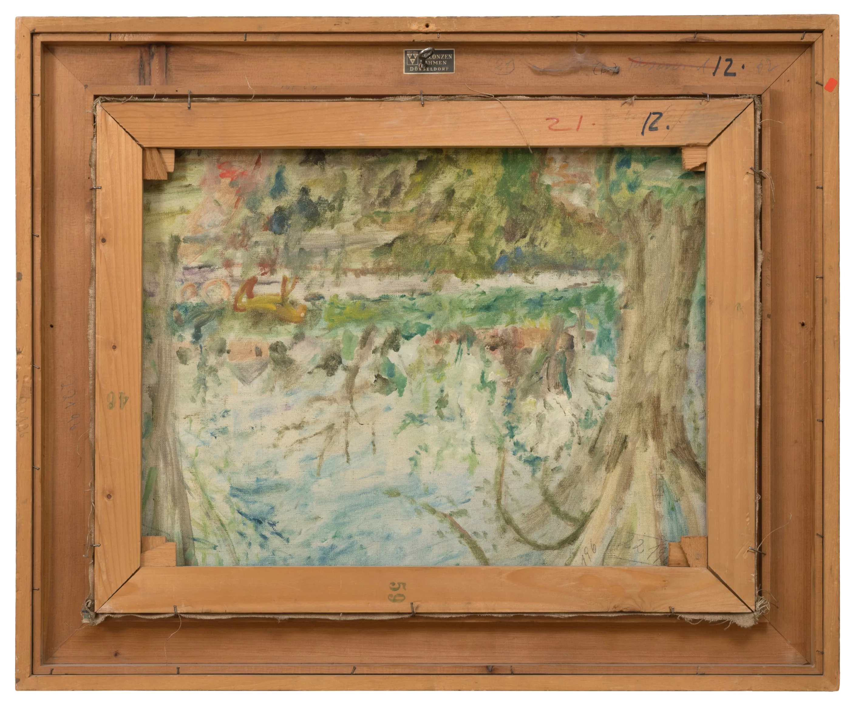 Still life with view of the Gnadenkirche in Mülheim Heißen, oil on canvas, 46 cm x 59 cm canvas dimensions, signed, dated 1948, canvas slightly wavy, landscape study on verso