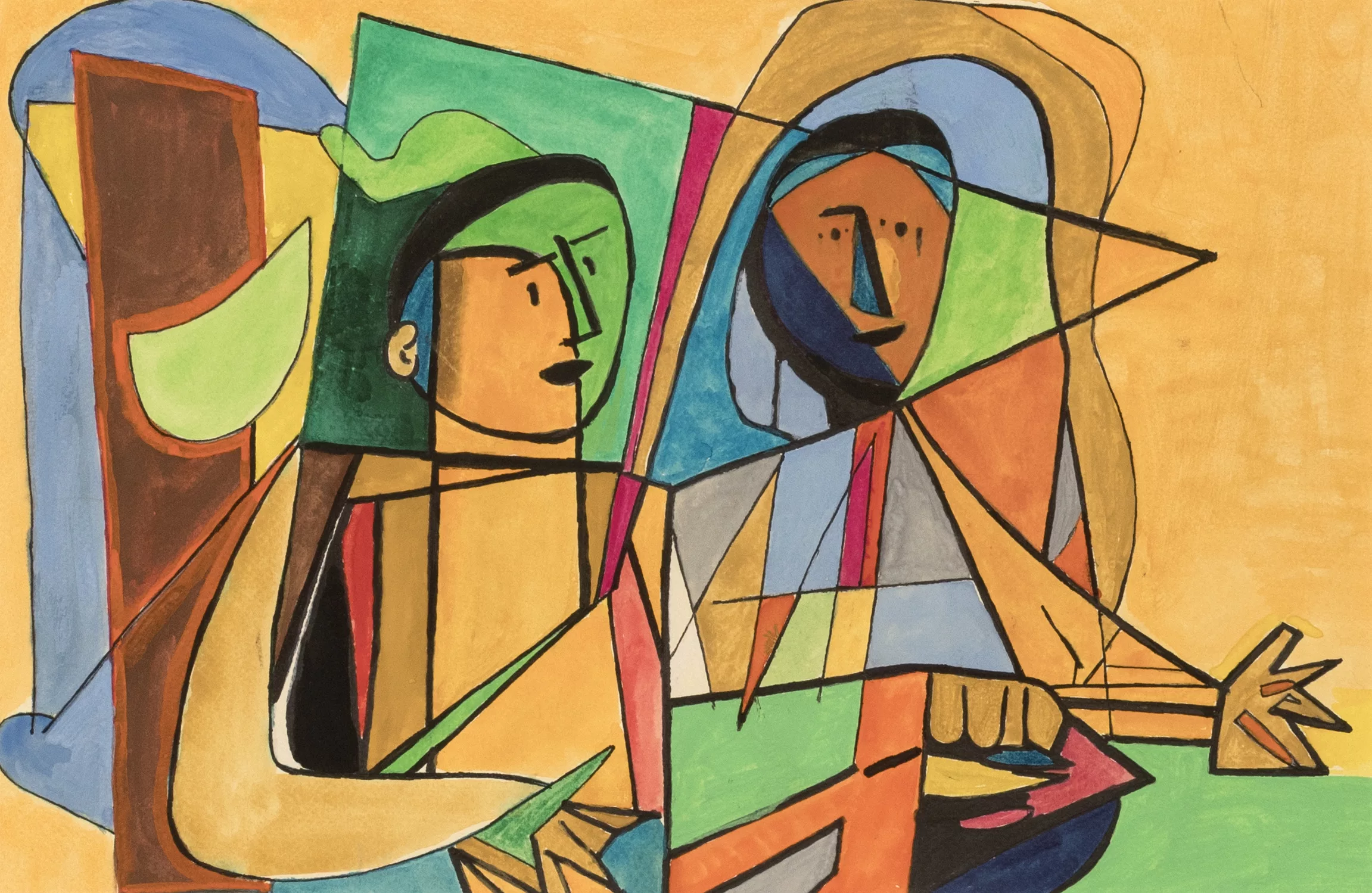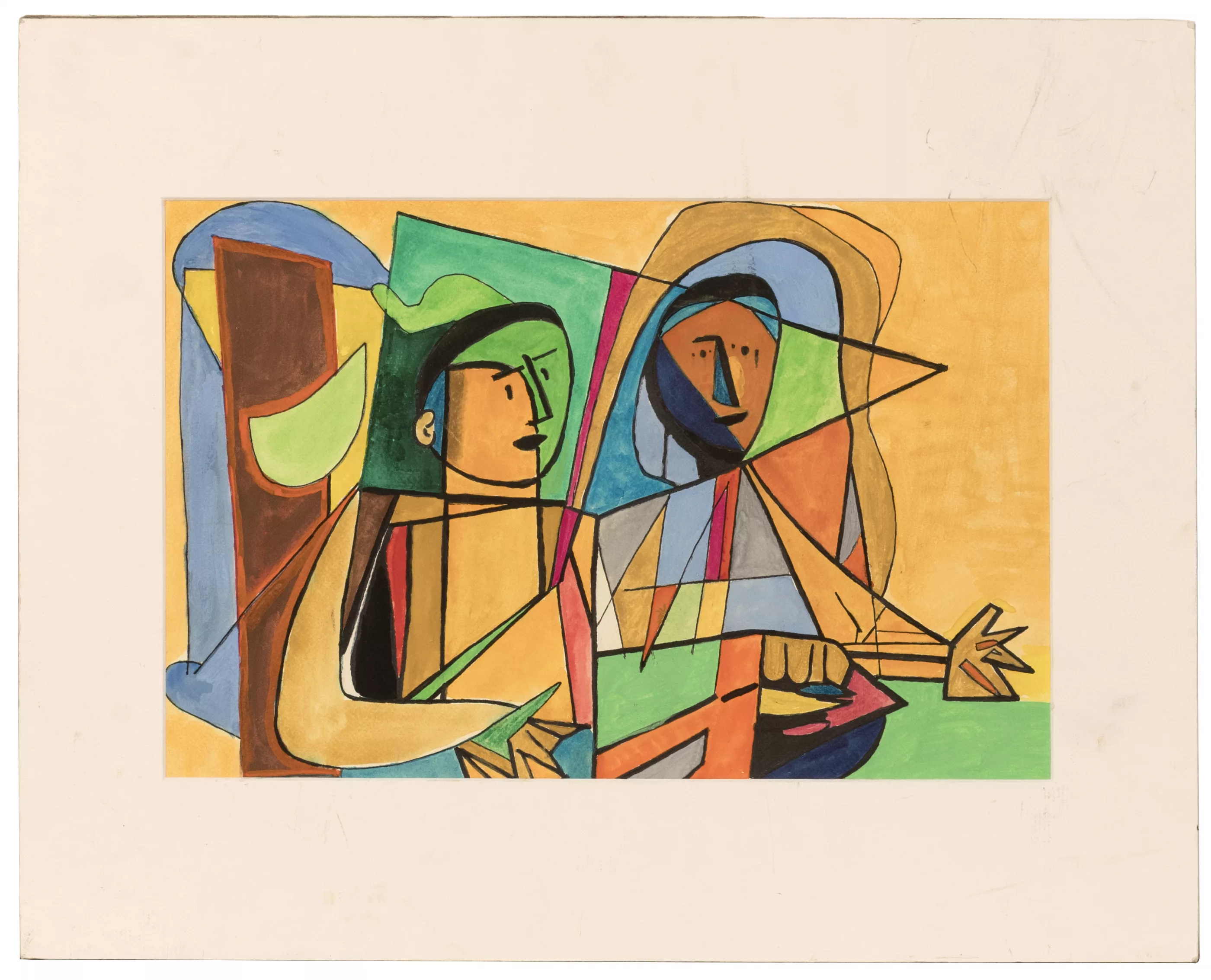 Two cubist figures, watercolour on paper, 24.5 cm x 37.5 cm inside mount dimensions, stamped on verso, partially rubbed, fully mounted, scratches in the picture field