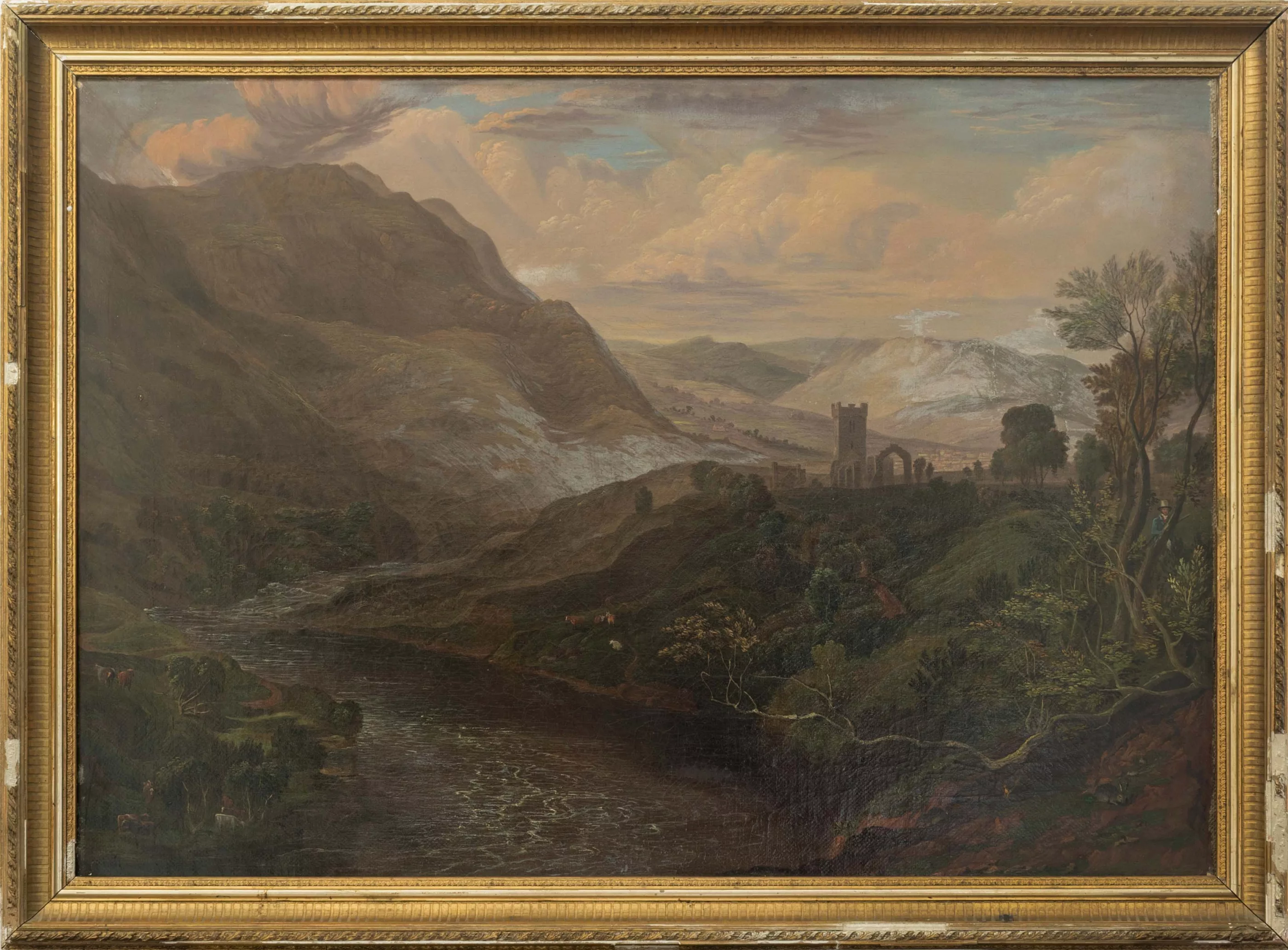River landscape, oil on canvas, 54 cm x 75 cm canvas dimensions, craquelure, retouched, rubbed, colour flaking at the edge