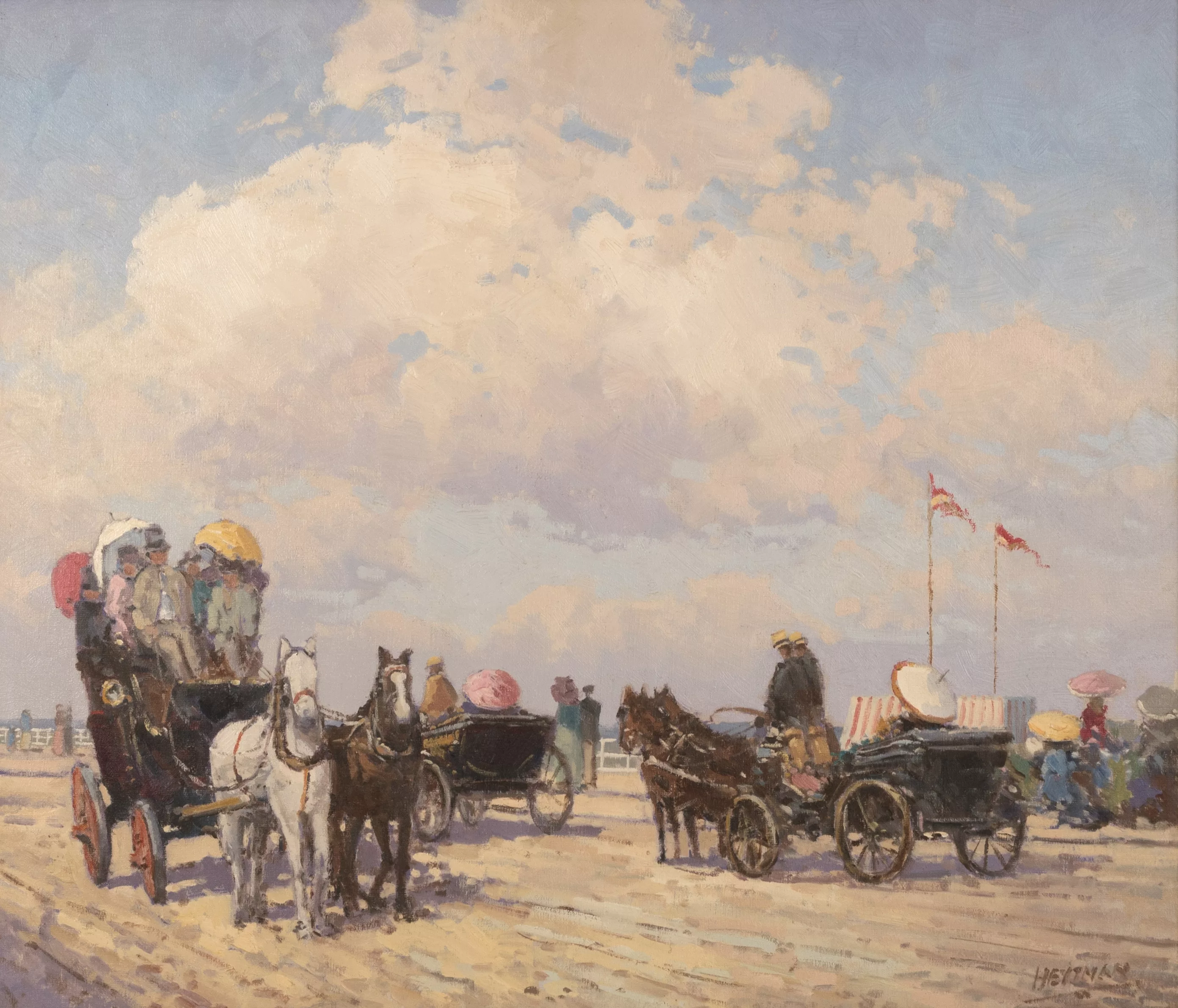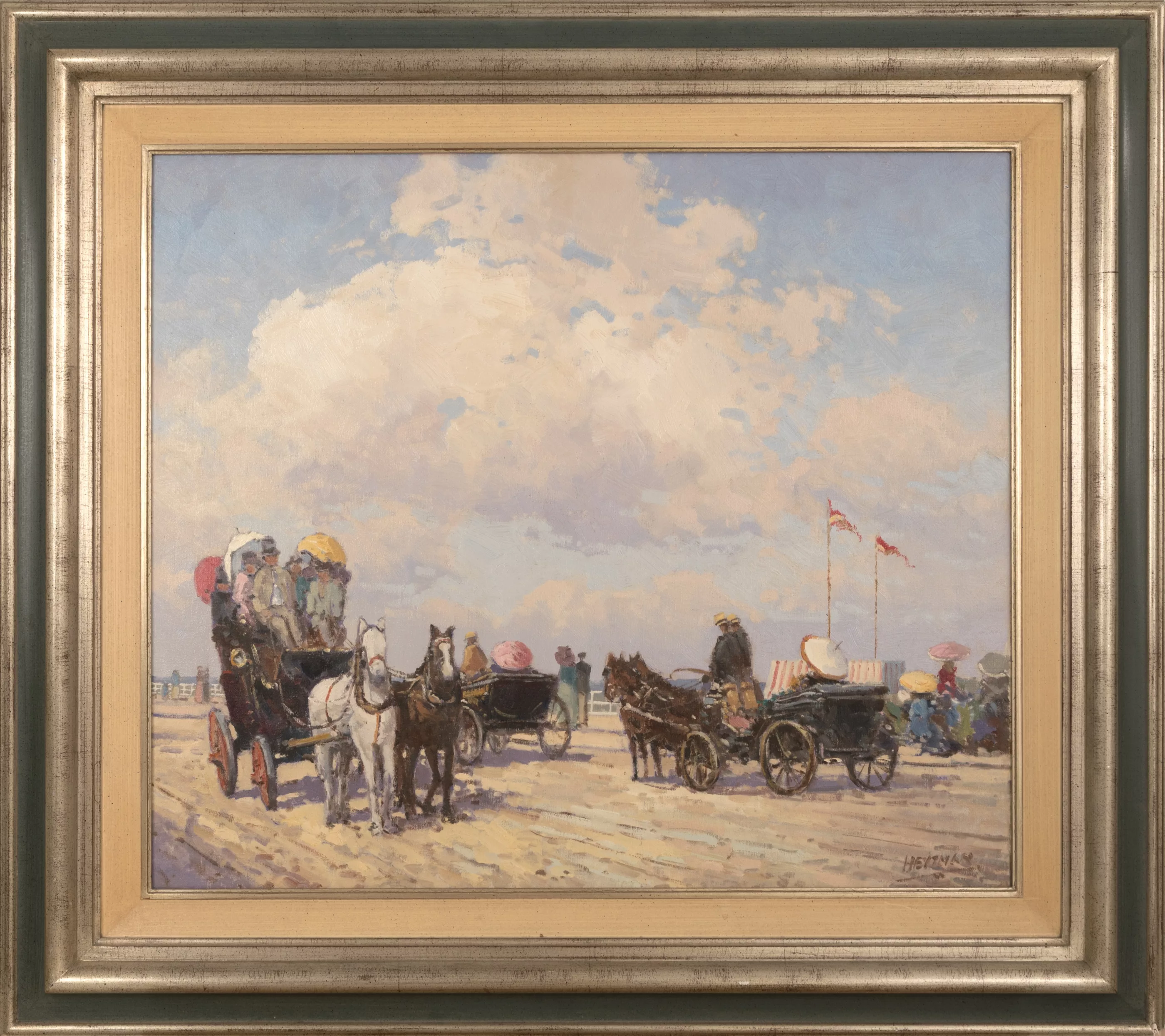 Carriages on the beach, oil on canvas, 60 cm x 70 cm canvas size, signed, original certificate enclosed