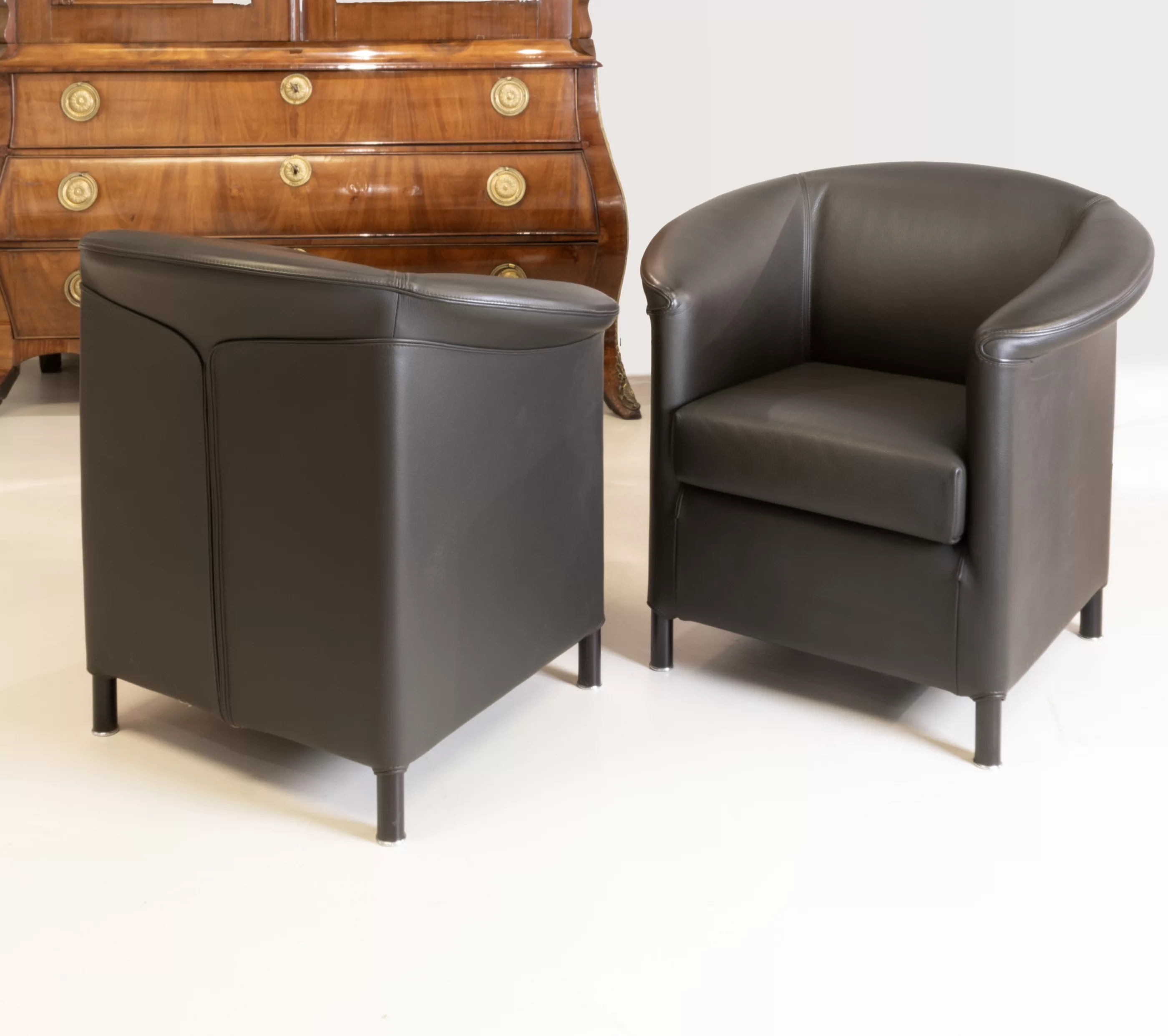 Wittmann, Österreich, Entwurf von Paolo Piva (1950 - 2017) aus dem Jahr 1983, Produktion 2010, Bezug aus weichem Nappaleder, schwarz-grau, unterseitig Textil, rückseitiger Reisverschluss, Sitzkissen abnehmbar, ebenfalls mit Reißverschluss , Holzstandfüße, schwarz lackiert, chromfarbene Kunststoffgleiter, jeweils auf unterseitigem Herstelleretikett signiert und 2010 datiert, 75,5 cm x 78 cm x 68 cm, Sitzhöhe 42 cm, kaum Alters- und Gebrauchsspuren, Zustand A