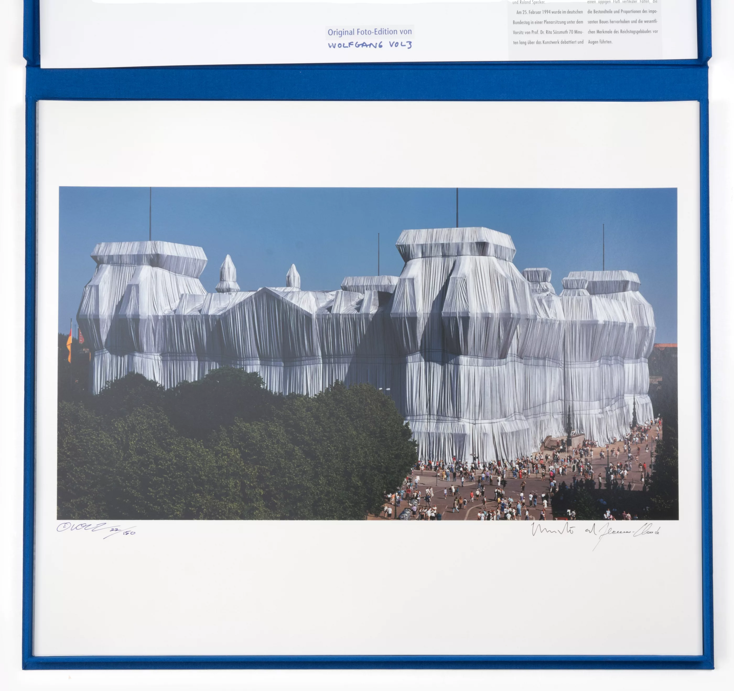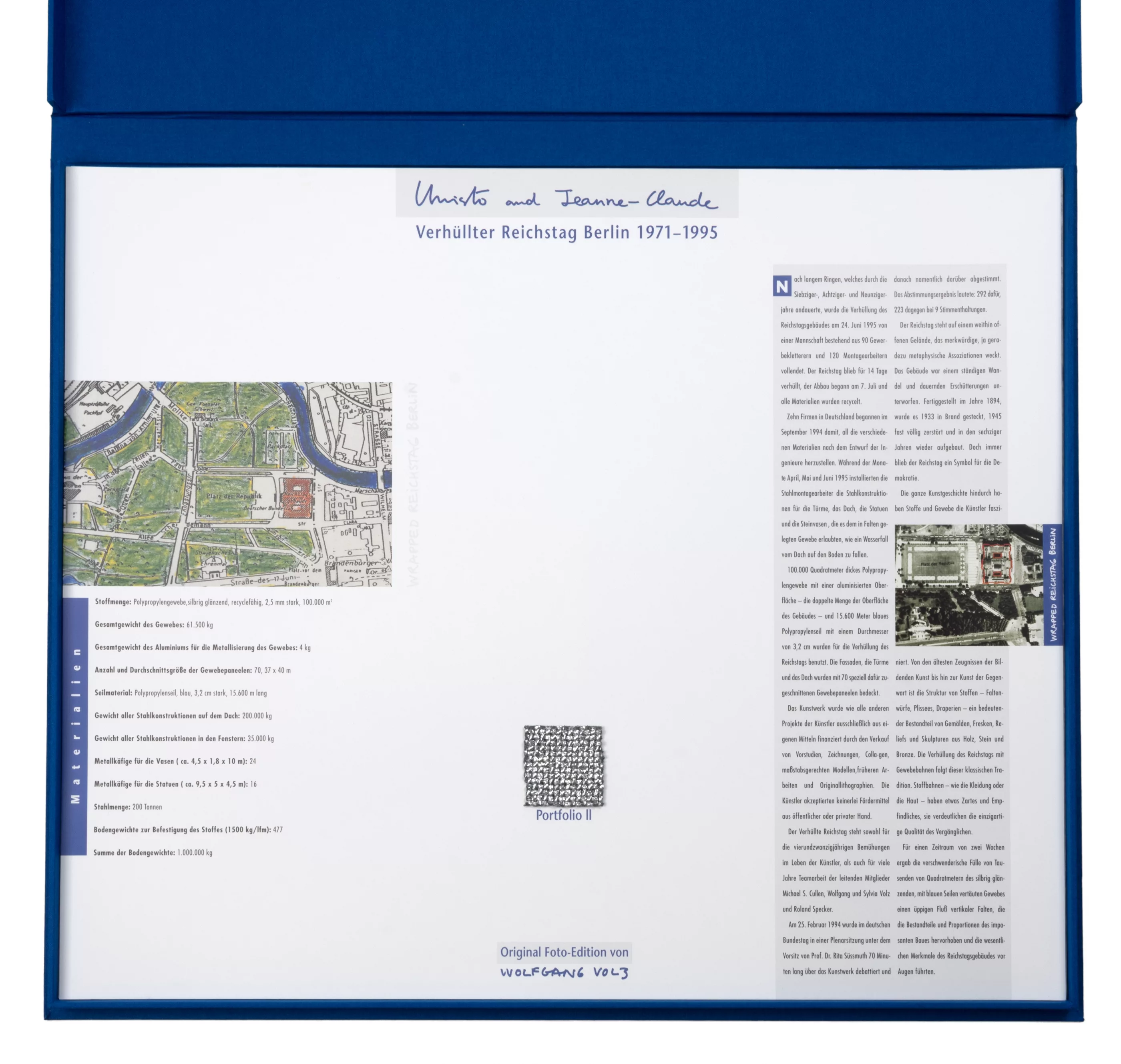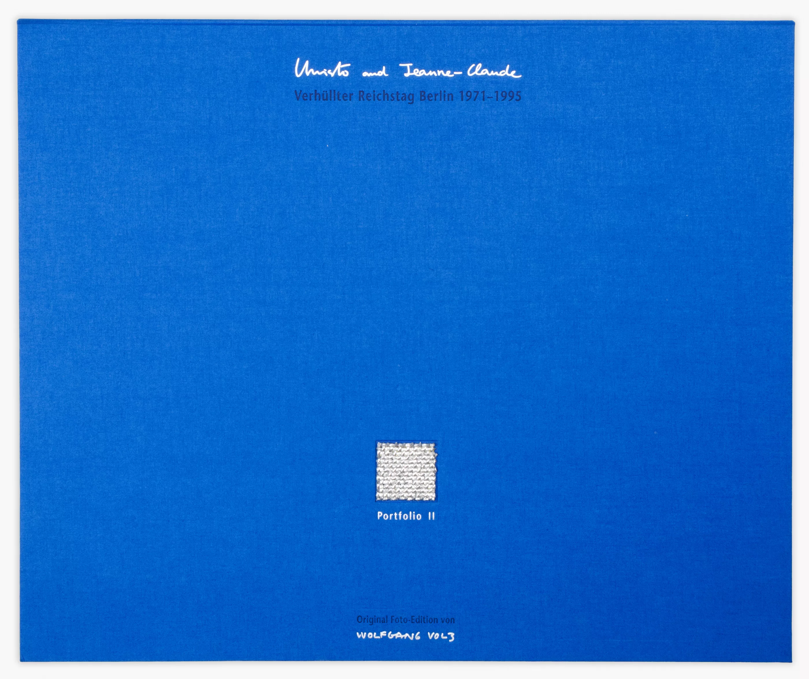 'Verhüllter Reichstag Berlin 1971-1995 - Portfolio II', 6-tlg., Mappenwerk, in blauer OLwd.-Kassette, 6 C-Prints auf festem Fotokarton, jeweils 50 cm x 60 cm Blattmaß, jeweils von Wolfgang Volz sowie Christo und Jeanne-Claude signiert, 22/150 nummeriert, mit einem Deckblatt und zwei Informationsblättern in deutscher Sprache, davon das Deckblatt sowie die OLwd.-Kassette mit einem Muster des zur Verhüllung verwendeten Polypropylengewebes
