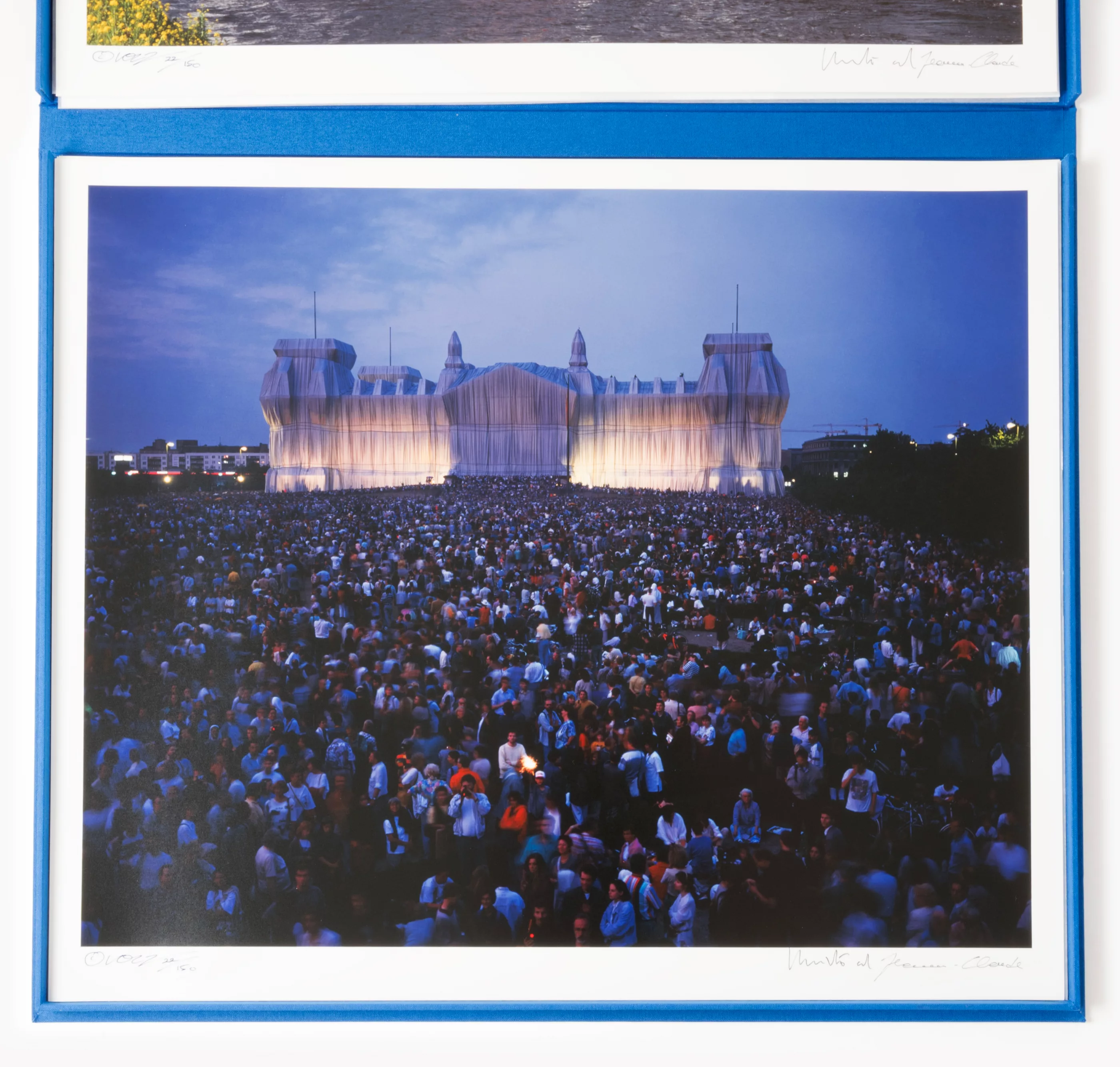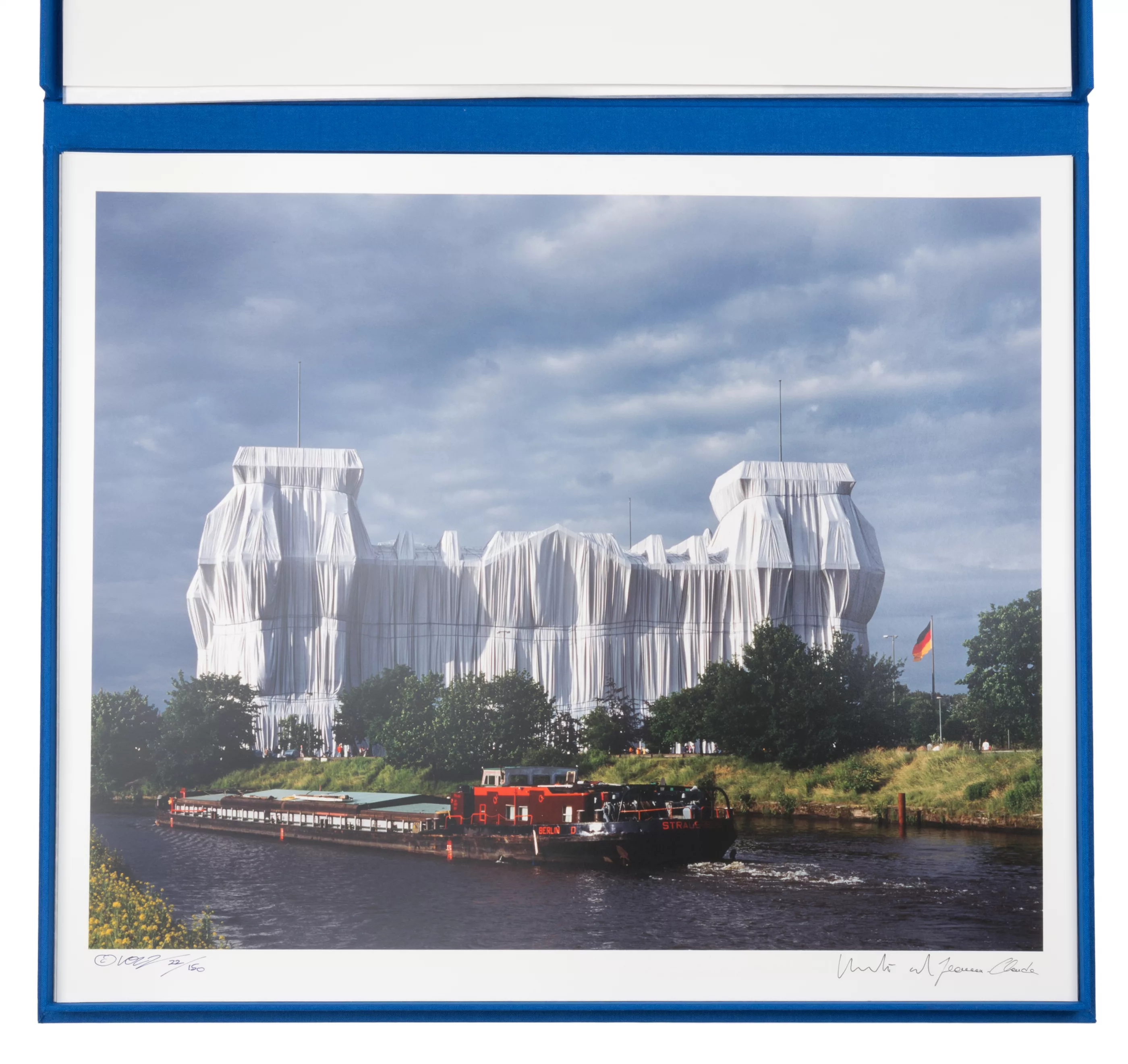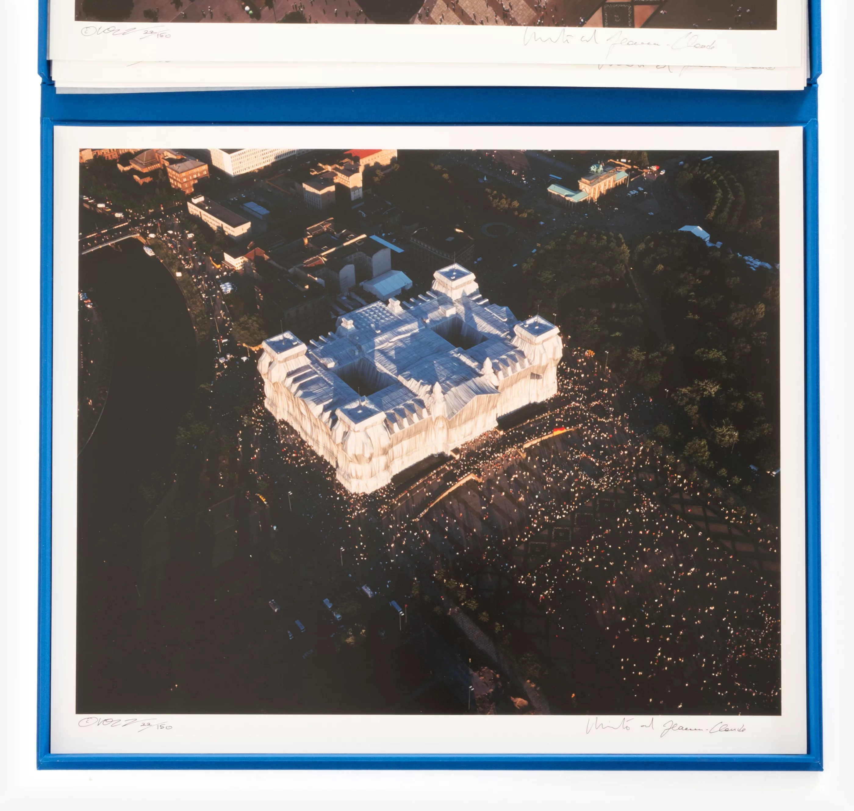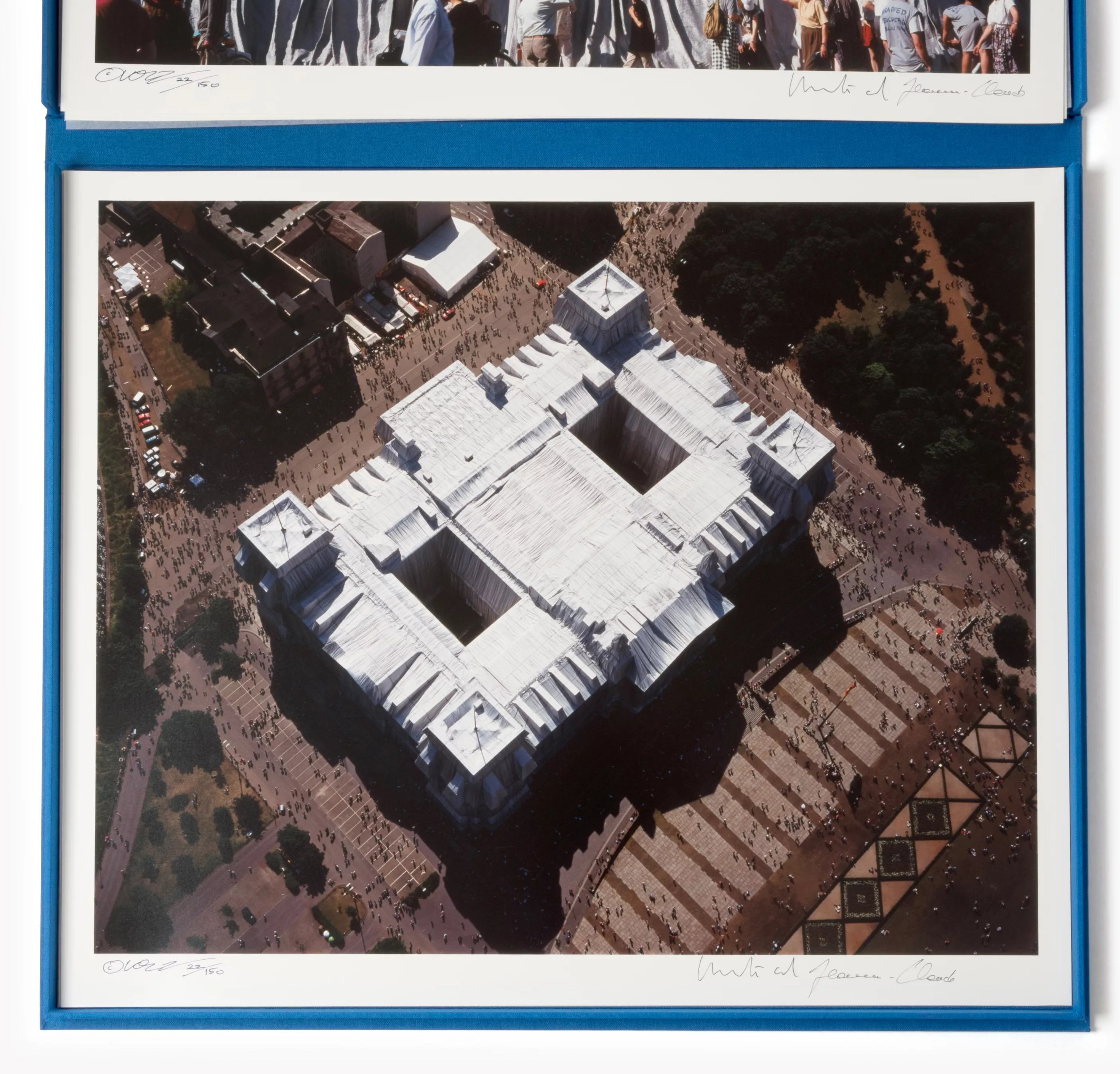 York and 1935 Casablanca - 2009 New York) (F) 'Wrapped Reichstag Berlin 1971-1995 - Portfolio II', 6-part portfolio, in a blue box, 6 C-prints on strong photo cardboard, each 50 cm x 60 cm sheet dimensions, each signed by Wolfgang Volz and Christo and Jeanne-Claude, numbered 22/150, with a cover sheet and two information sheets in German, the cover sheet and the box with a sample of the polypropylene fabric used for the wrapping