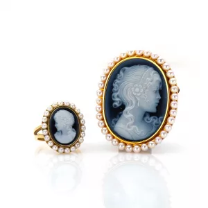 Brosche und Ring mit Mondstein-Diamantbesatz